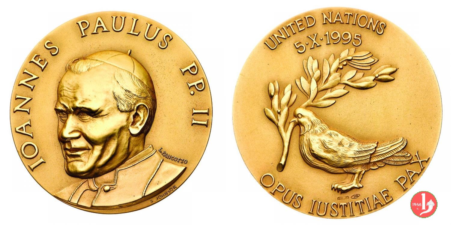 nel campo, attorniato da elementi decorativi: COMMEMORATING = THE POPE JOHN PAUL II = ADDRESS TO THE = UNITED NATIONS = 1995