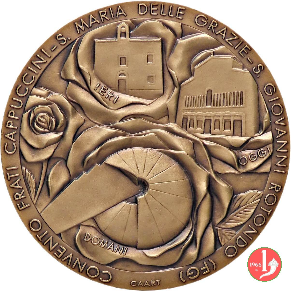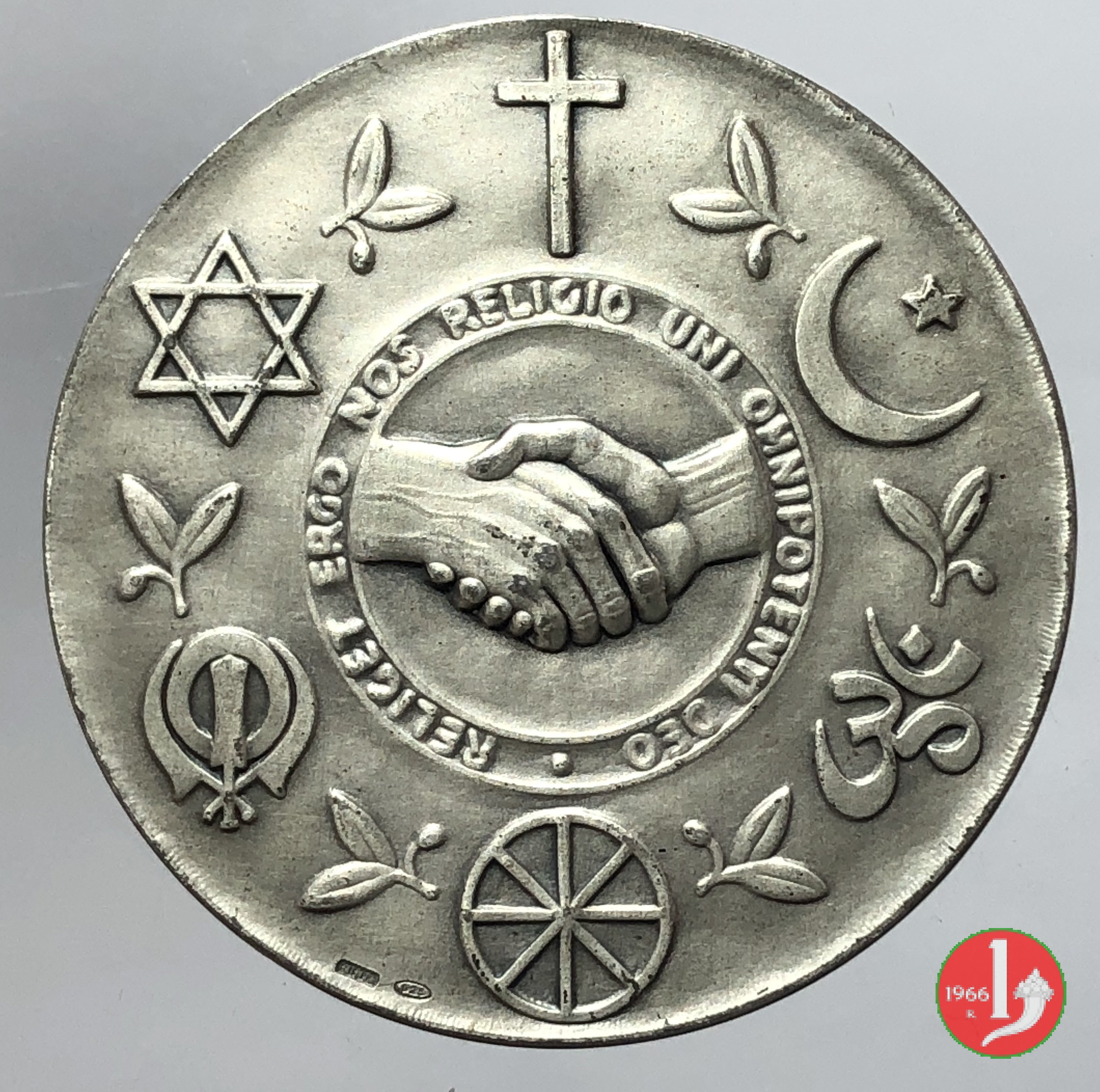 Verso: entro ampia fascia perimetrale e intervallati da rametti d'alloro: Croce, mezza luna sormontata da stella, legenda araba, ruota, stella di David