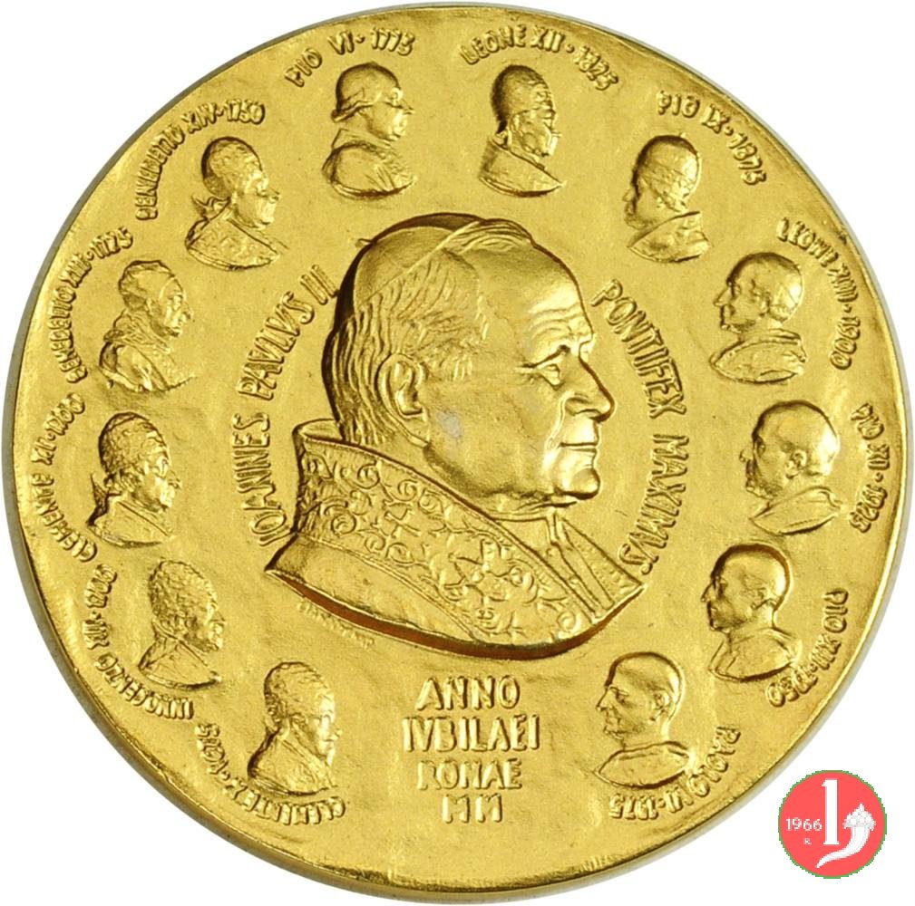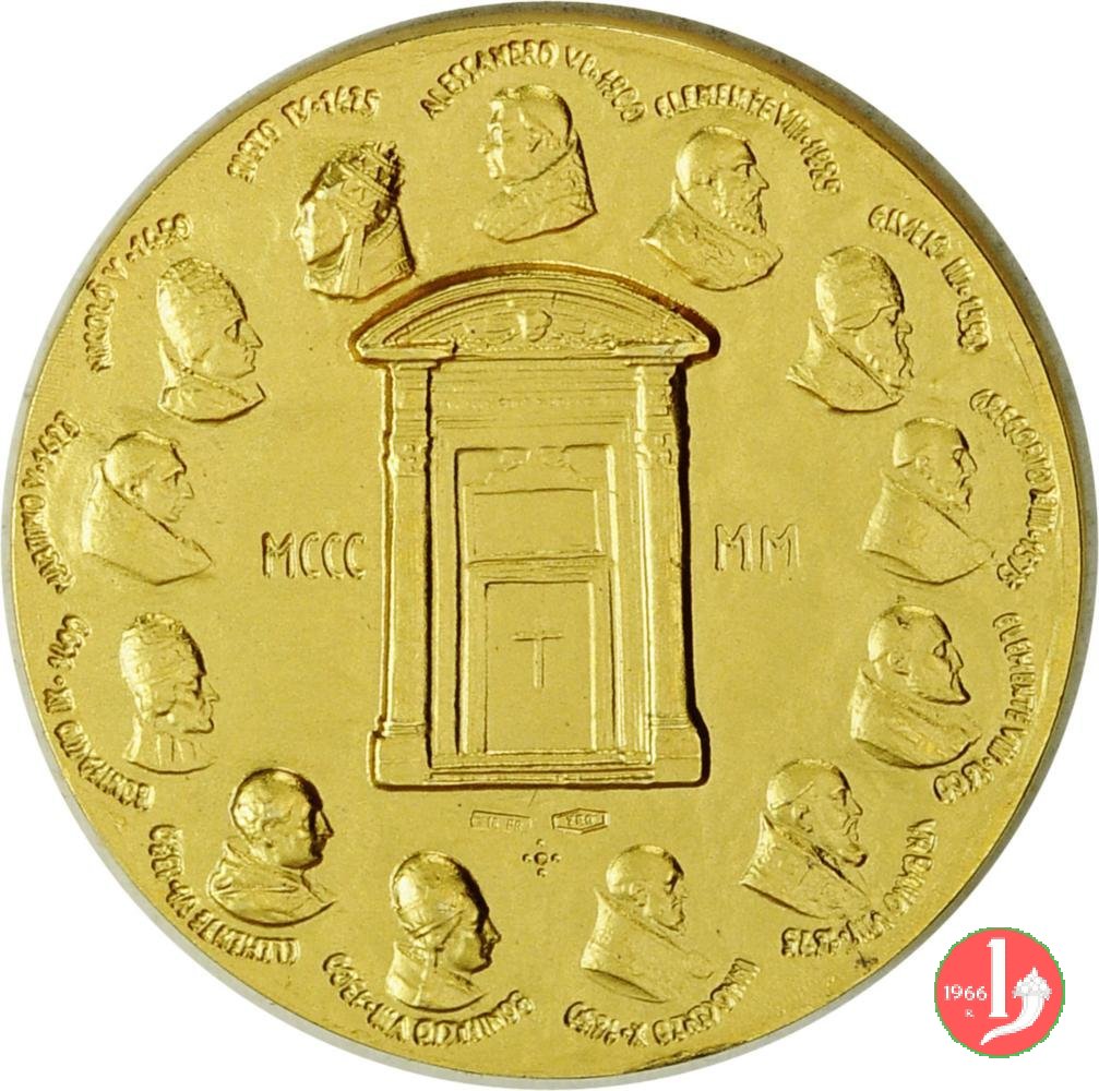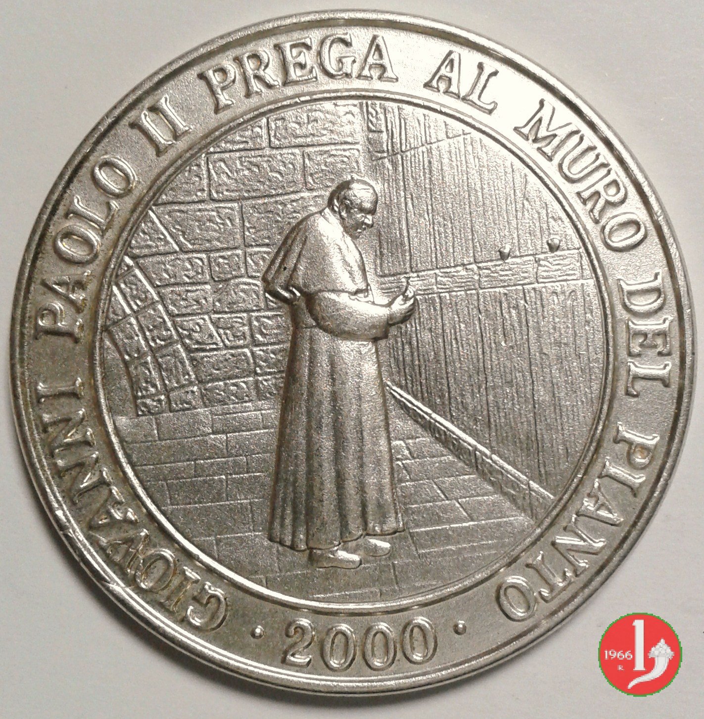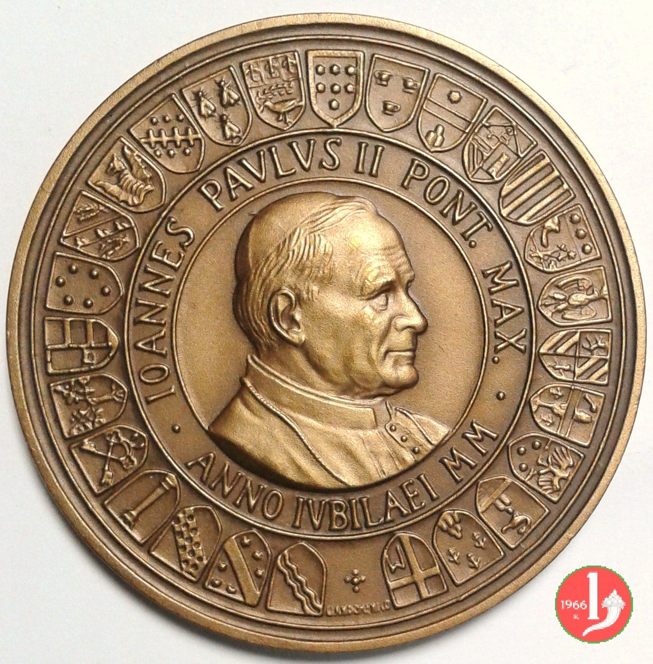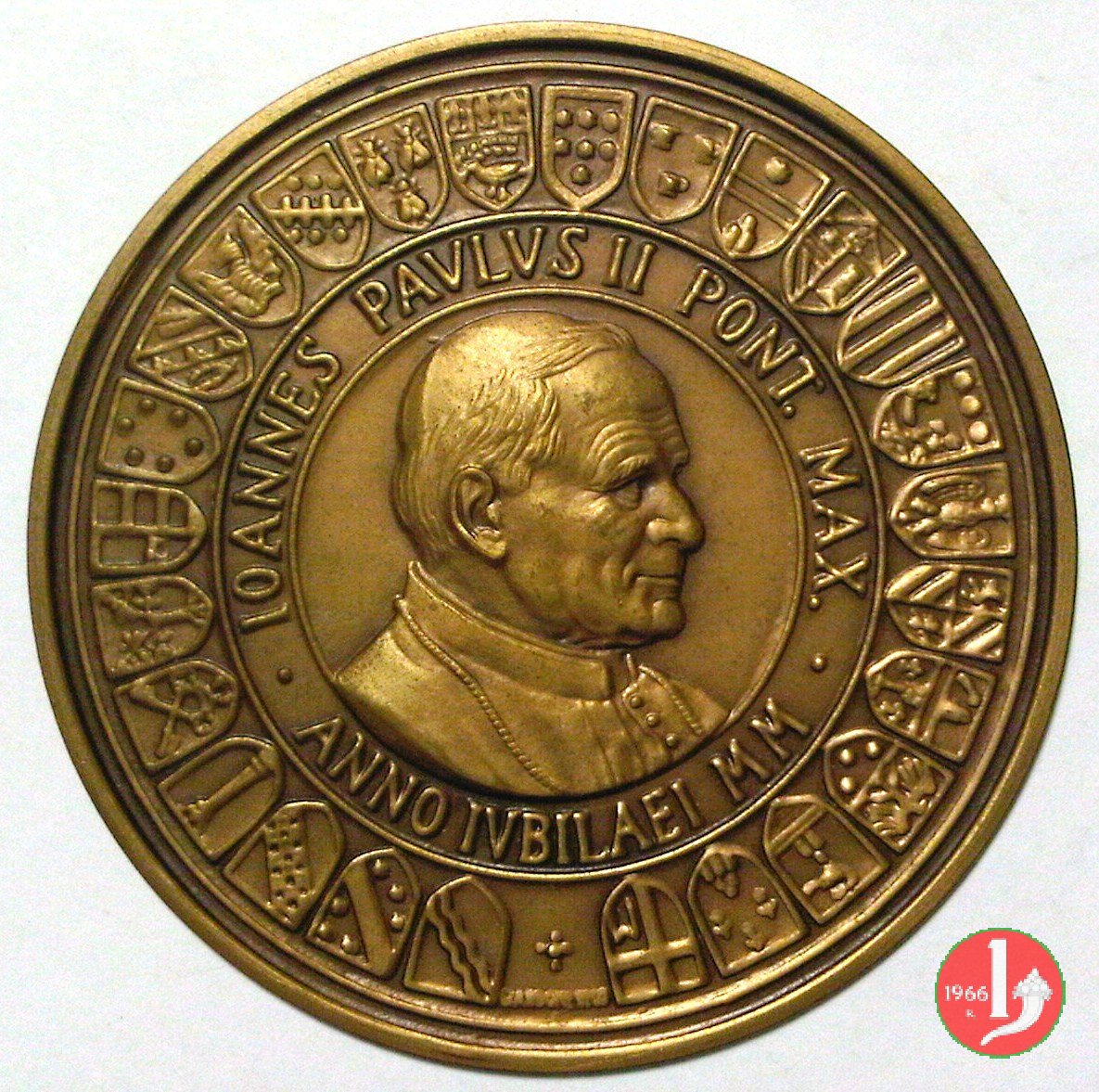 Dritto: Nel cerchio gli stemmi dei ventisei papi che hanno aperto la Porta Santa e sotto croce, nel cerchio interno: IOANNES PAVLVS II PONT. MAX. = • ANNO IVBILAEI MM •