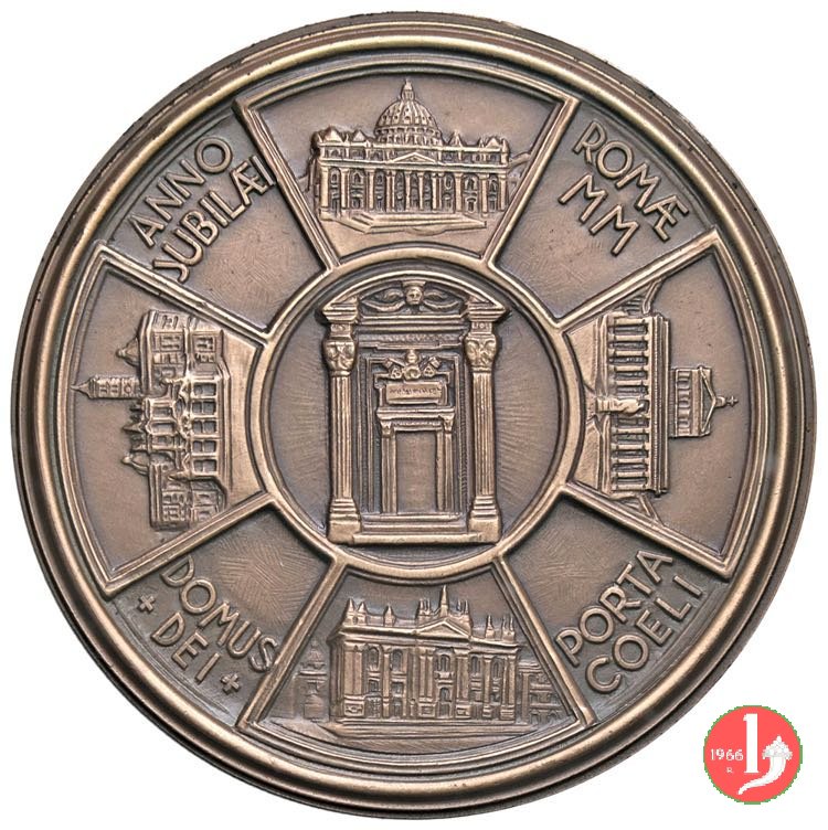 Verso: campo diviso in otto settori, dall'alto in senso orario: prospetto della Basilica di San Pietro _ ROMAE = MM _ Prospetto della Basilica di San Paolo fuori le mura _ PORTAE = COELI _ Vista della Basilica di San Giovanni in Laterano _ DOMUS = • DEI • _ Prospetto della Basilica di Santa Maria Maggiore _ ANNO = JUBILAEI