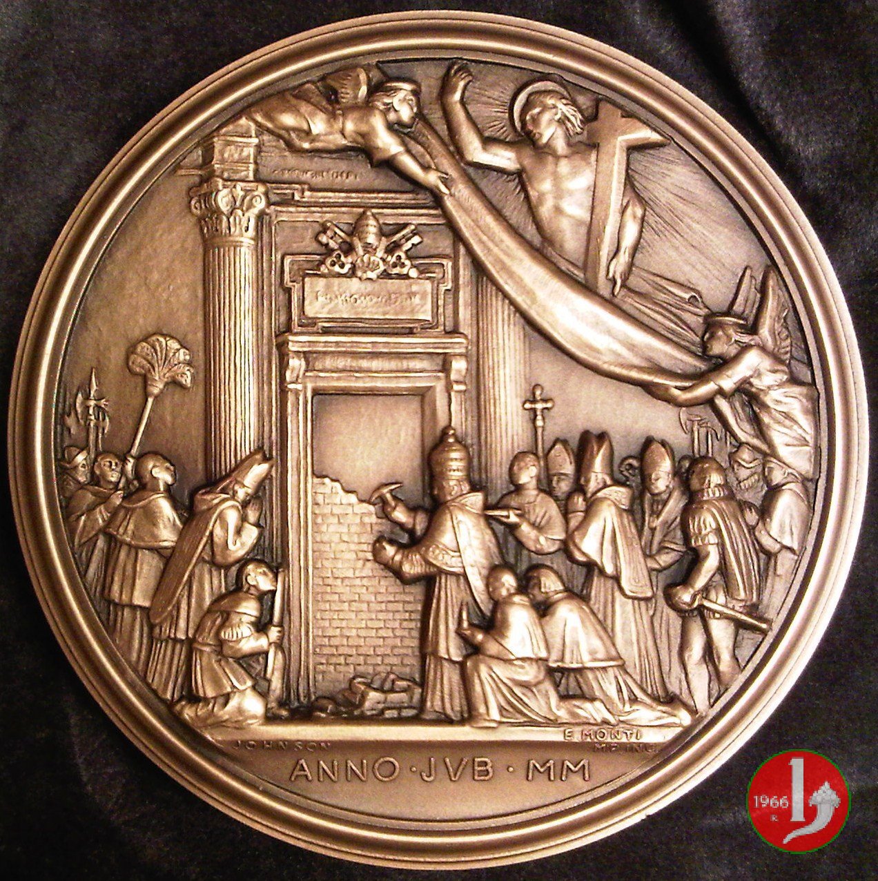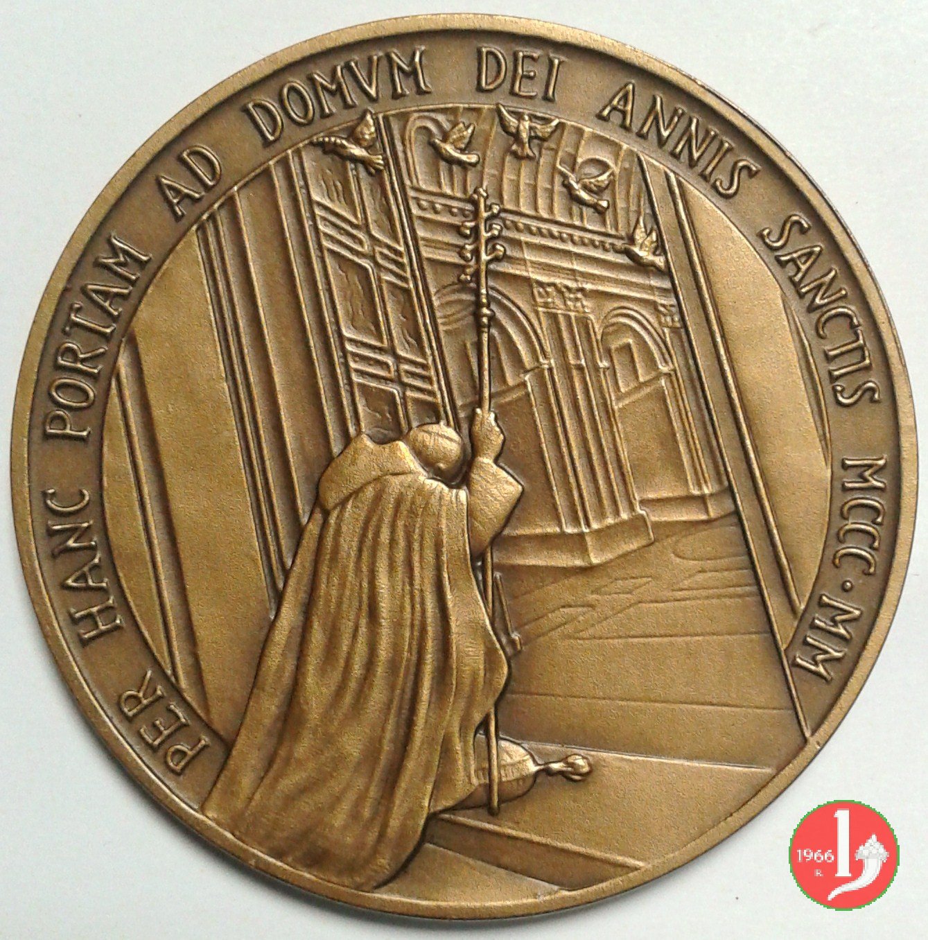 Dritto: Busto centrale di Papa Giovanni Paolo II volto a dx con berretto, mozzetta e stola, attorno: IOANNES PAVLVS II _ PONTIFEX MAXIMVS attorniato dai busti di dodici Papi suoi predecessori, con i nomi e le date di apertura che hanno aperto la Porta Santa