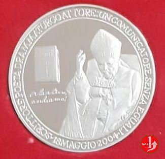 Vita del Papa - Alzatevi Andiamo! 2004 Dritto: SCRITTORE POETA DRAMMATURGO ATTORE entro cerchio continuo: busto seduto in trono, benedicente di 3/4 a sx, con mitra, piviale e Croce pettorale nel campo a sx: il volume Alzatevi Andiamo! sotto a sx in corsivo ALZATEVI = ANDIAMO! Stemma papale su chiavi decussate e coronato da triregno (nell'argento sotto lo stemma il N° dell'esemplare) |