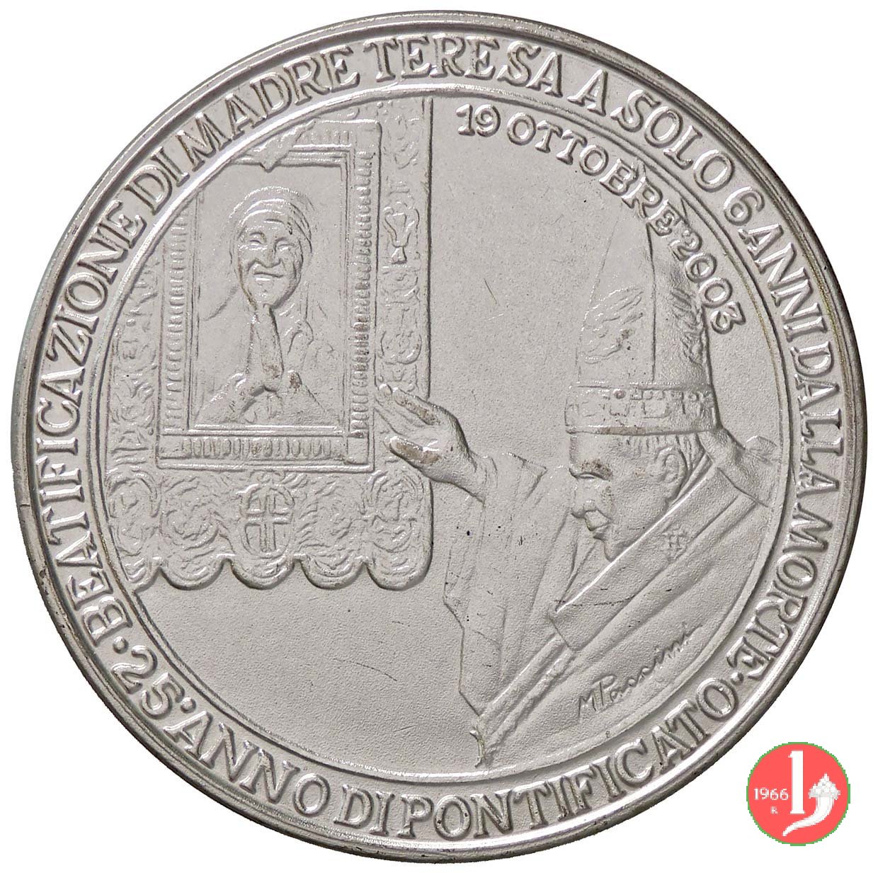 Beatificazione di Madre Teresa 19-10-2003 Dritto: IOANNES PAVLVS II PONT. MAX. busto a sx con berretto, mozzetta e stola busto a sx con tiara e pallio, indica l'immagine di Madre Teresa, entro quadro a sx firmata a dx: M PACCINI | |
