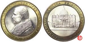 Basilica di San Pietro 34mm Dritto: JOANNES PAULVS II PONTIFEX MAXIMVS = AN. XXVI busto a sx con berretto, mozzetta e stola in basso a sx: GIANDOMENICO Prospetto anteriore della Basilica Vaticana | |