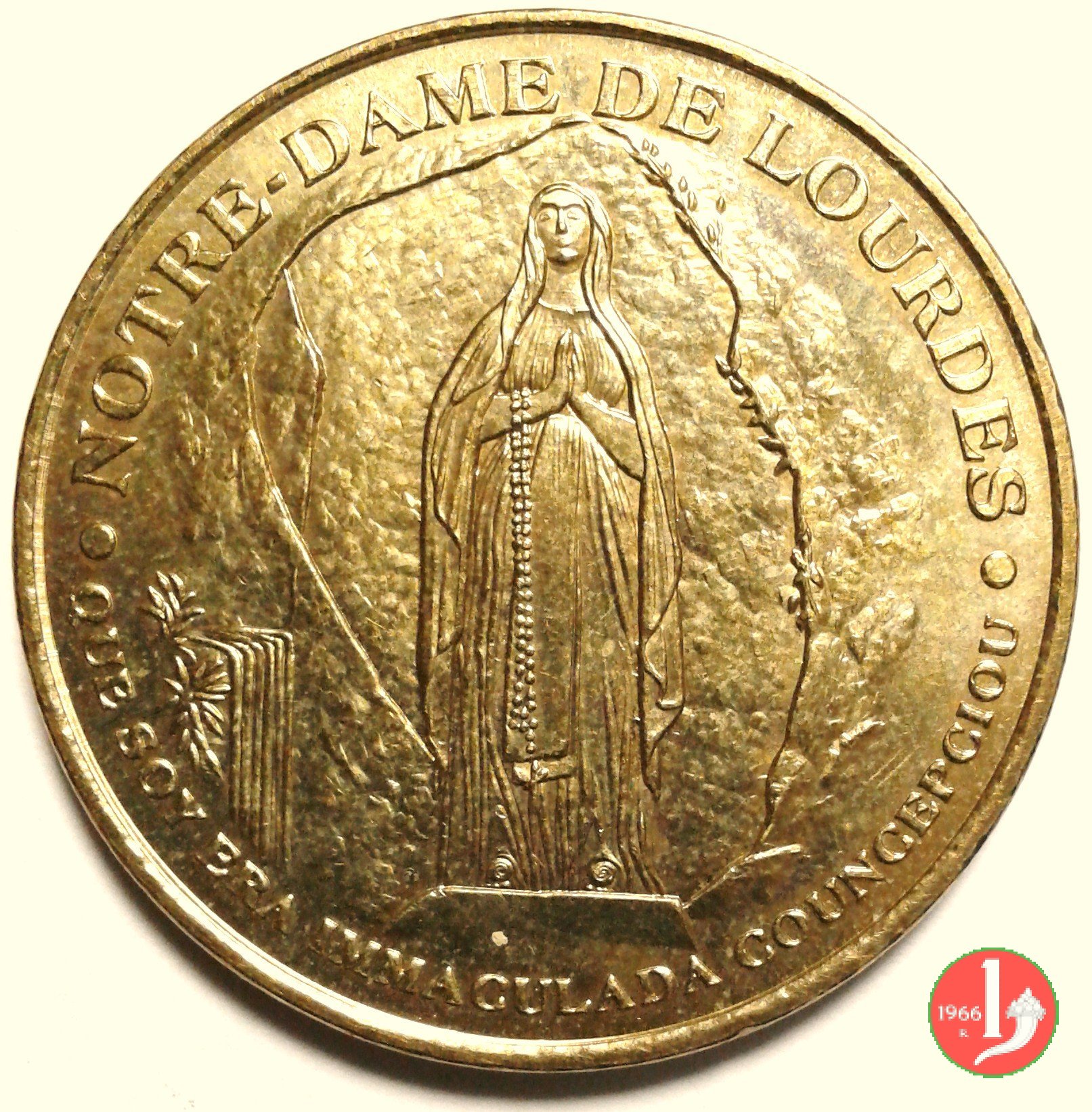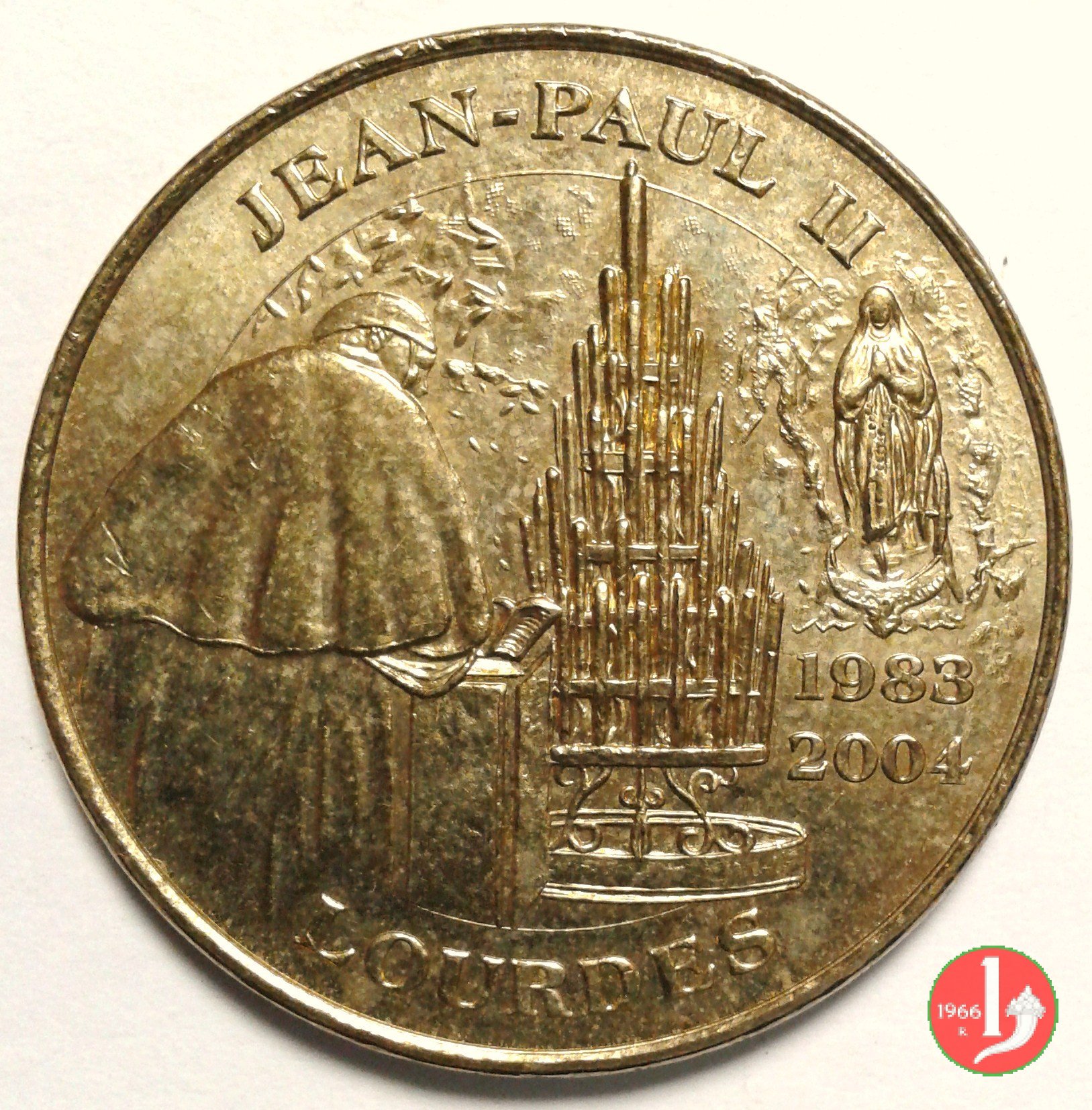 Viaggio a Lourdes 14-08-2004 Dritto: • IOANNES PAVLVS II • = LOUDES 14-15.VIII.2004 busto di 3/4 a dx sulla spalla: L. PANCOTTO La B.V. di Luordes di fronte | |