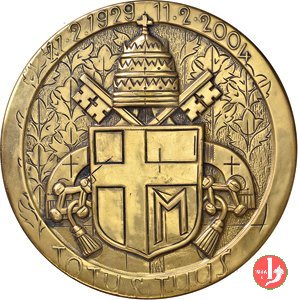 75° Patti Lateranensi 60mm Dritto: mezzo busto di Giovanni Paolo II seduto a dx con mitra e pastorale, sullo sfondo la Colomba dello Spirito Santo irraggia il busto di Pio XI benedicente di 3/4 a sx con berretto e mozzetta in basso: BODINI triregno su chiavi decussate sovrapposto a campo con elementi floreali nel campo a sx: 75° | |