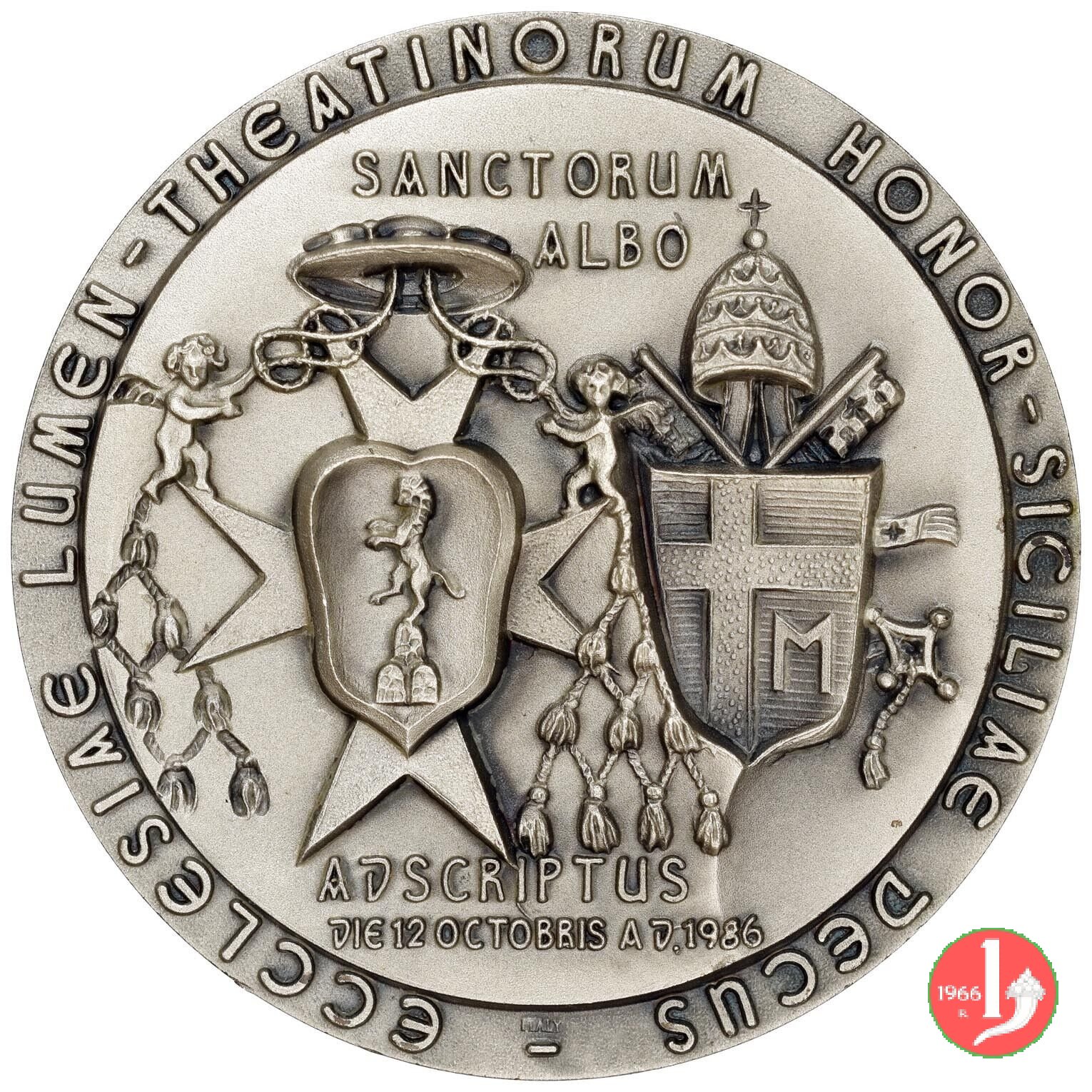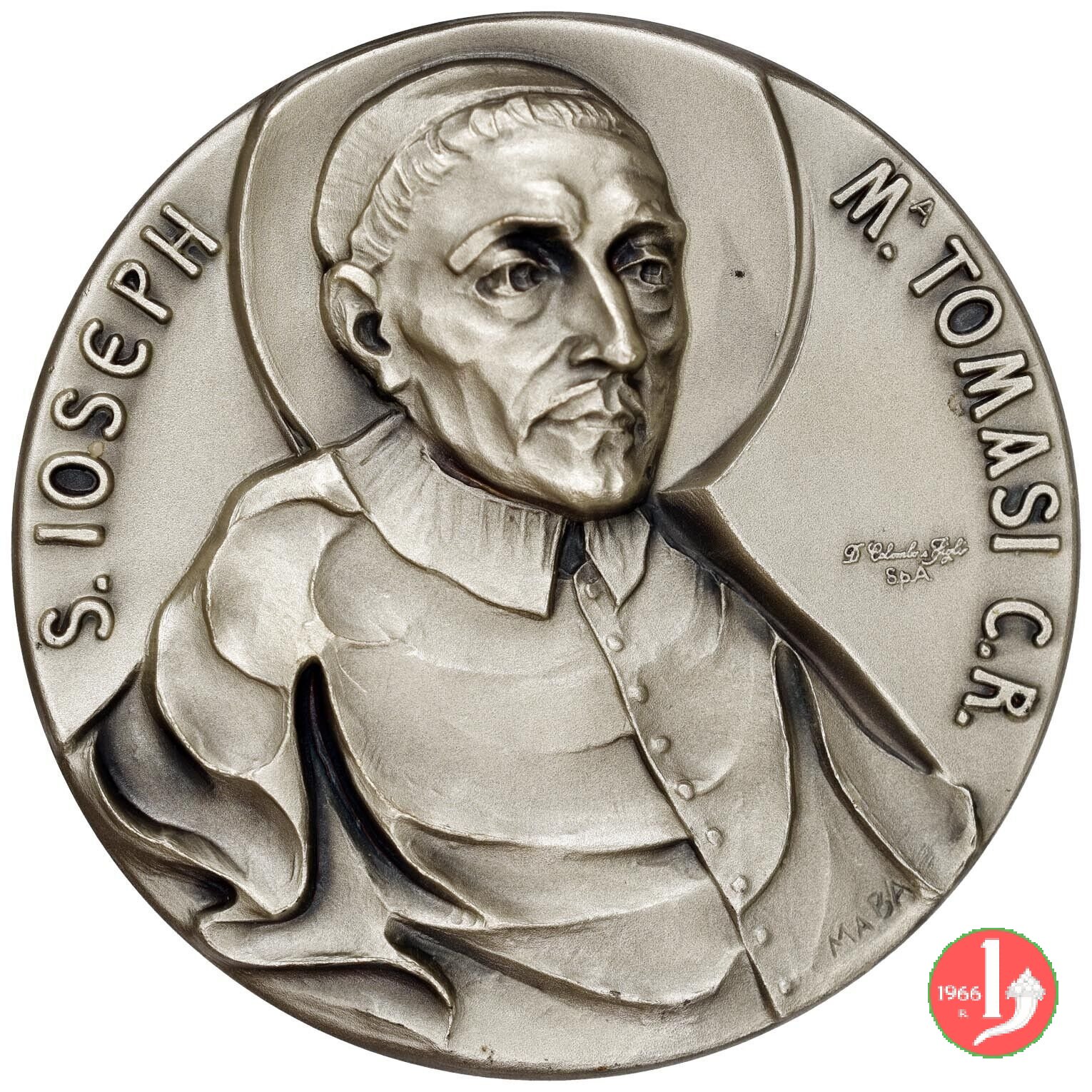 Canonizzazione Giuseppe M. Tomasi 12-10-86 Dritto: S. IOSEPH _ M. TOMASI busto nimbato del nuovo Santo di fronte con mozzetta nel campo, a dx: D. COLOMBO & Figli = SPA in basso: MABA Stemma Cardinalizio su Croce con leone rampante, sormontato da galero a dieci nodi, affiancato allo Stemma Papale , su chiavi decussate, sormontato da triregno in alto: SANCTORUM = ALBO in basso: ADSCIPTUS = DIE 12 OCTOBRIS A.D. 1986 | |