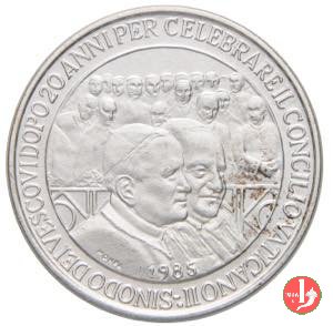 Sinodo dei Vescovi 24-11-85 Dritto: IOANNES PAVLVS II PONT. MAX • busto a sx con zucchetto mozzetta e stola Busti affiancati a dx di Giovanni Paolo II e Giovanni XXIII, sullo sfondo vari prelati sotto: 1985 in basso a sx: MONPA |