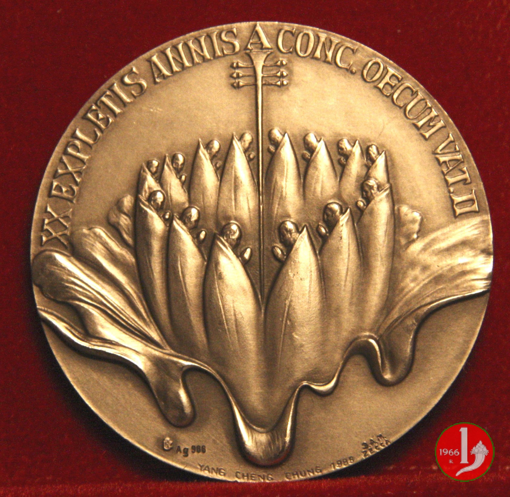 A. VIII -XX Anniversario del Concilio Vaticano II Dritto: JOANNES PAULUS II P • M • ANNO VIII Il Papa genuflesso verso dx I padri conciliari in cerchio attorno a croce sotto: YANG CHENG CHUNG 1985 S.A.M. / ZECCA | |