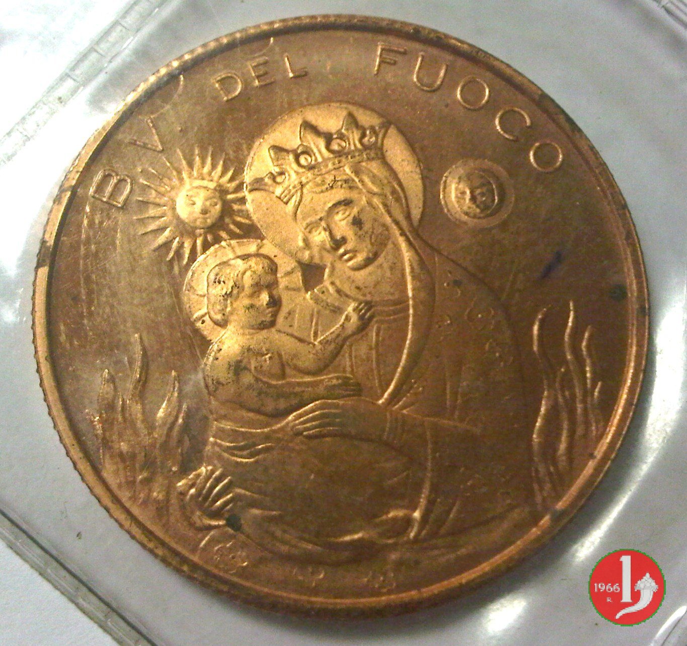 Visita a Forlí 08-05-1986 Dritto: IOANNES PAULUS II FORLI' 8 - V - 1986 Busto a sx con berretto, mozzetta e stola Madonna coronata con bambino nimbati tra il sole e la luna, ai lati fiamme | |
