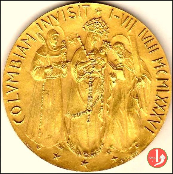 Visita in Colombia-N.S. Chiquinquira 01-07-86 Dritto: VISITA APOSTOLICA DE S.S. JUAN PABLO II = ✠ COLOMBIA 1986 ✠ busto a dx con berretto, mozzetta, stola e pastorale La B. V. in piedi di fronte tra due Santi | |
