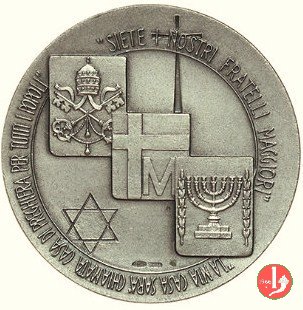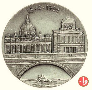 Comunità Ebraica di Roma 13-04-1986 Dritto: 13 • 4 • 1986 Prospetti affiancati della Basilica Vaticana e del Tempio Ebraico di Roma, sotto: arcata di ponte in basso: GIANDOMENICO nel campo tre riquadri disposti diagonalmente con: triregno e chiavi, stemma Papale, candelabro a sette bracci tra due spighe di grano in basso, a sx: stella di David in alto, a dx: Crocifisso | |