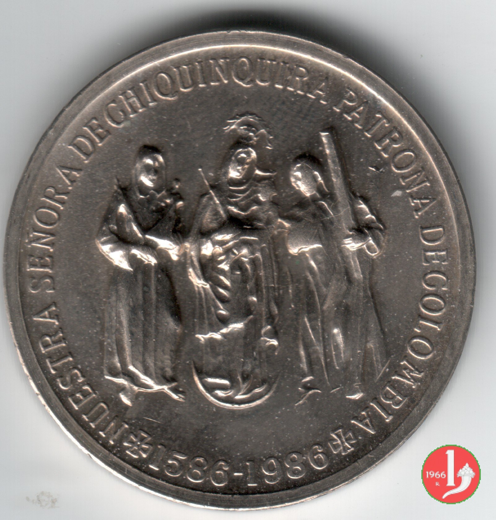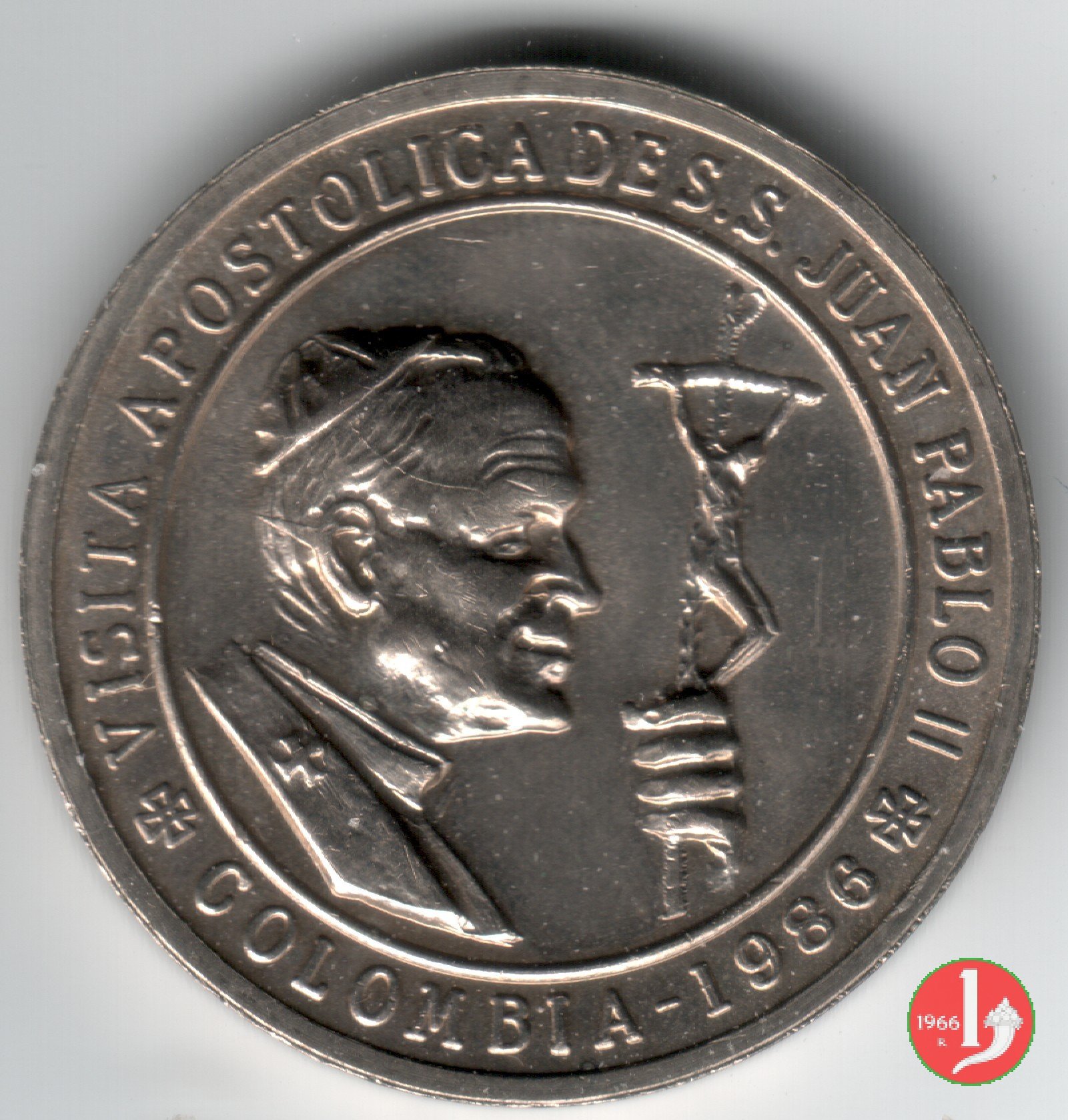Visita in Colombia 01-07-86 Dritto: IOANNES PAVLVS PP. II busto di 3/4 a sx con mitra, pastorale, pallio e pianeta in basso a dx: E. MANFRINI La B.V. in piedi di fronte, coronata con Bambino, tra due Santi nimbati sotto: * * * in basso a dx: E. MANFRINI in basso a sx: S. JOHNSON | |