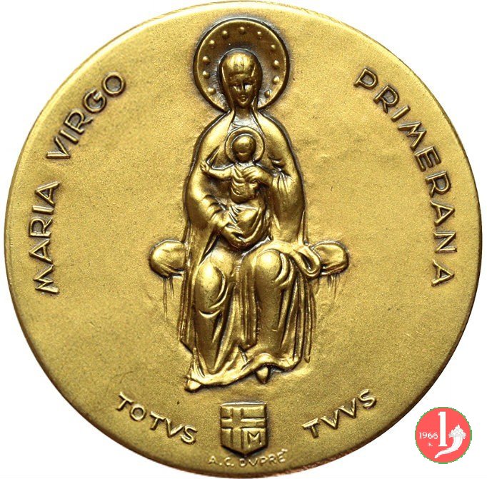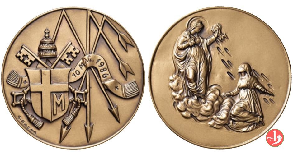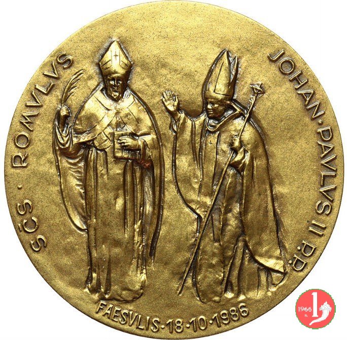 Visita a Fiesole 18-10-1986 Dritto: SCS • ROMVLVS _ JOHAN • PAVLVS II P.P. a sx: San Romolo in piedi di fronte con mitra e pianeta regge libro e ramo di palma; a dx: Il Papa in piedi, benedicente a sx, con mitra, pianeta, pastorale e pallio sotto: FAESVLIS • 18 • 10 • 1986 La B. V. seduta col Bambino (riproduzione della Vergine Primerana a di Luca Greco del 1270) sotto Stemma Papale tra: TOTVS _ TVVS in basso: A. C. DUPRE' | |