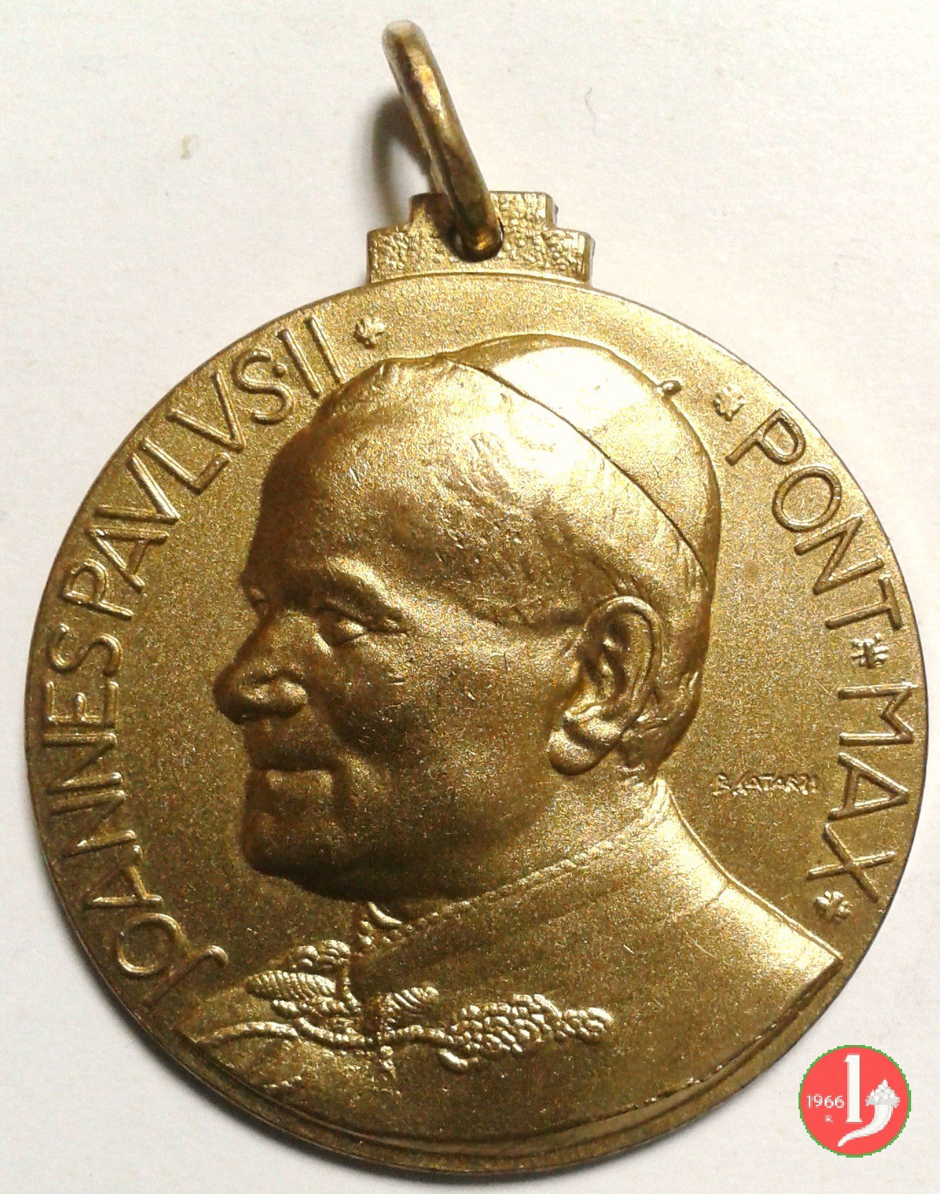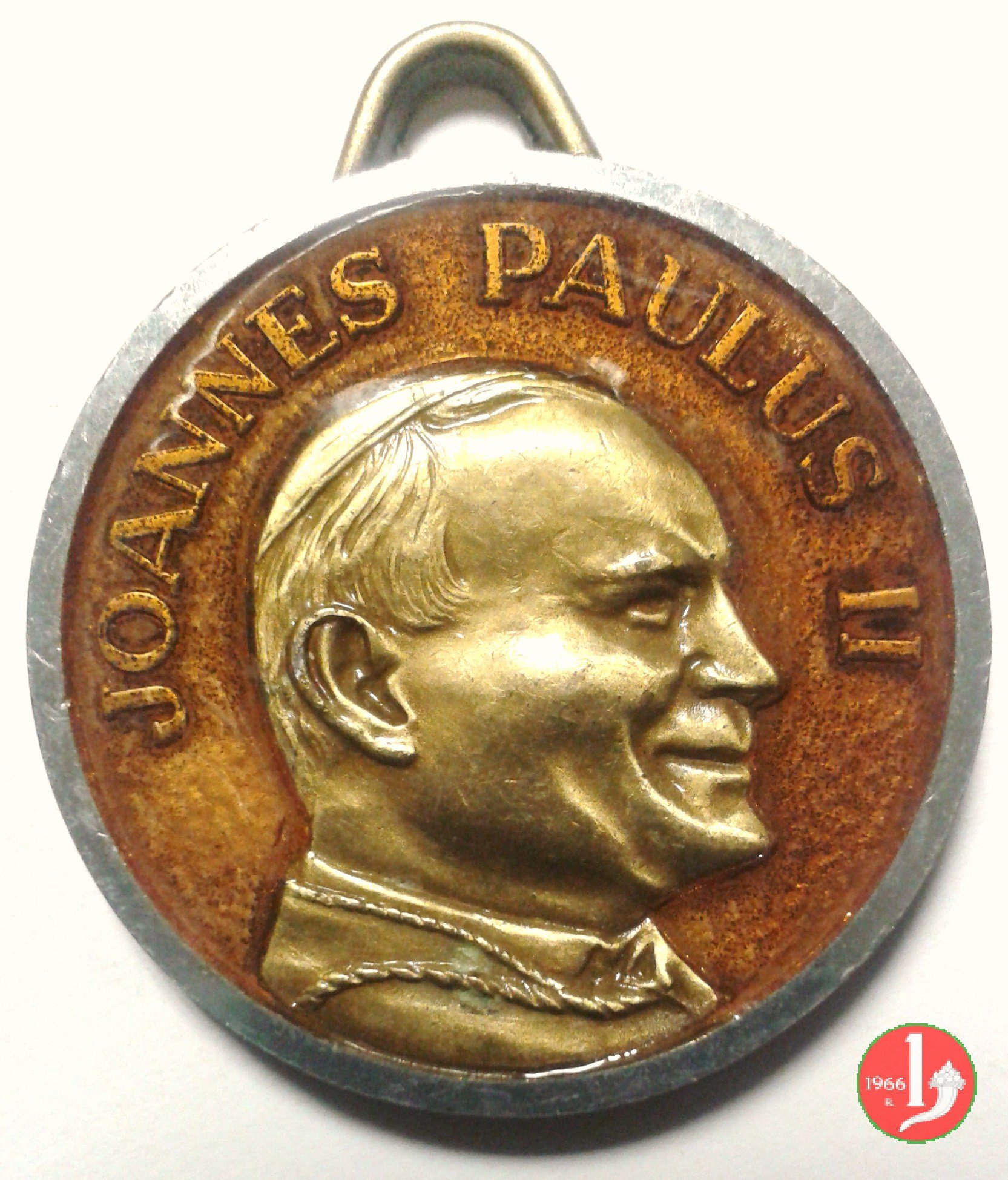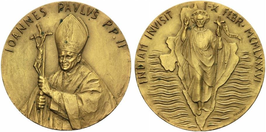 Visita in India 01-02-86 Dritto: IOANNES PAVLVS PP. II busto di 3/4 a sx con mitra e pastorale sotto: E. MANFRINI San Tommaso Benedicente nimbato, in piedi, di fronte, con pastorale sull'India in basso | |
