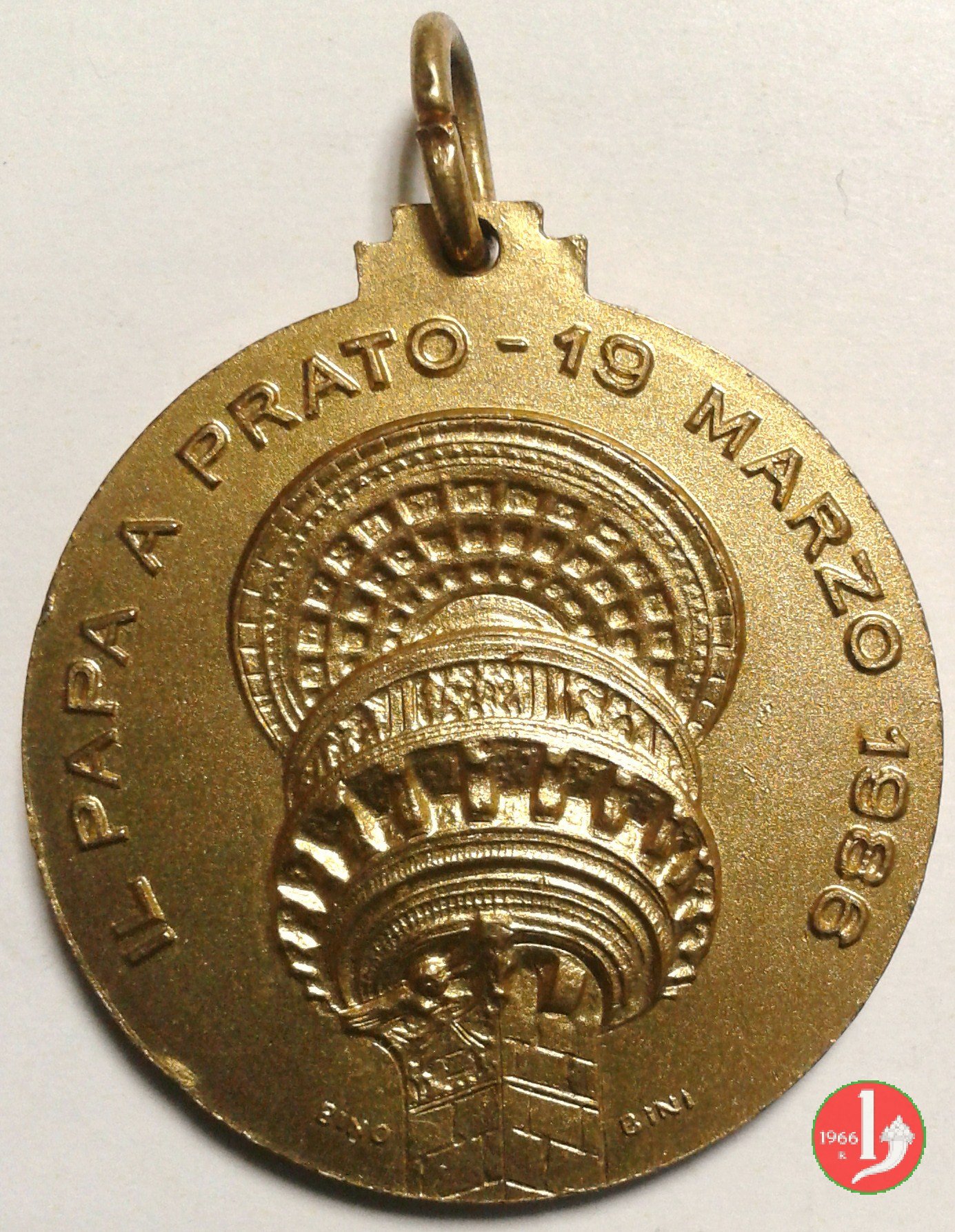 Visita a Prato 19-03-1986 Dritto: JOANNES PAVLVS II ✠ _ PONT ✠ MAX ✠ busto a sx con zucchetto e mantellina nel campo a dx: B. CATARZI vista del Pulpito esterno del Duomo di Prato (realizzato da Donatello tra il 1428 e il 1438) in basso: BINO _ BINI | |