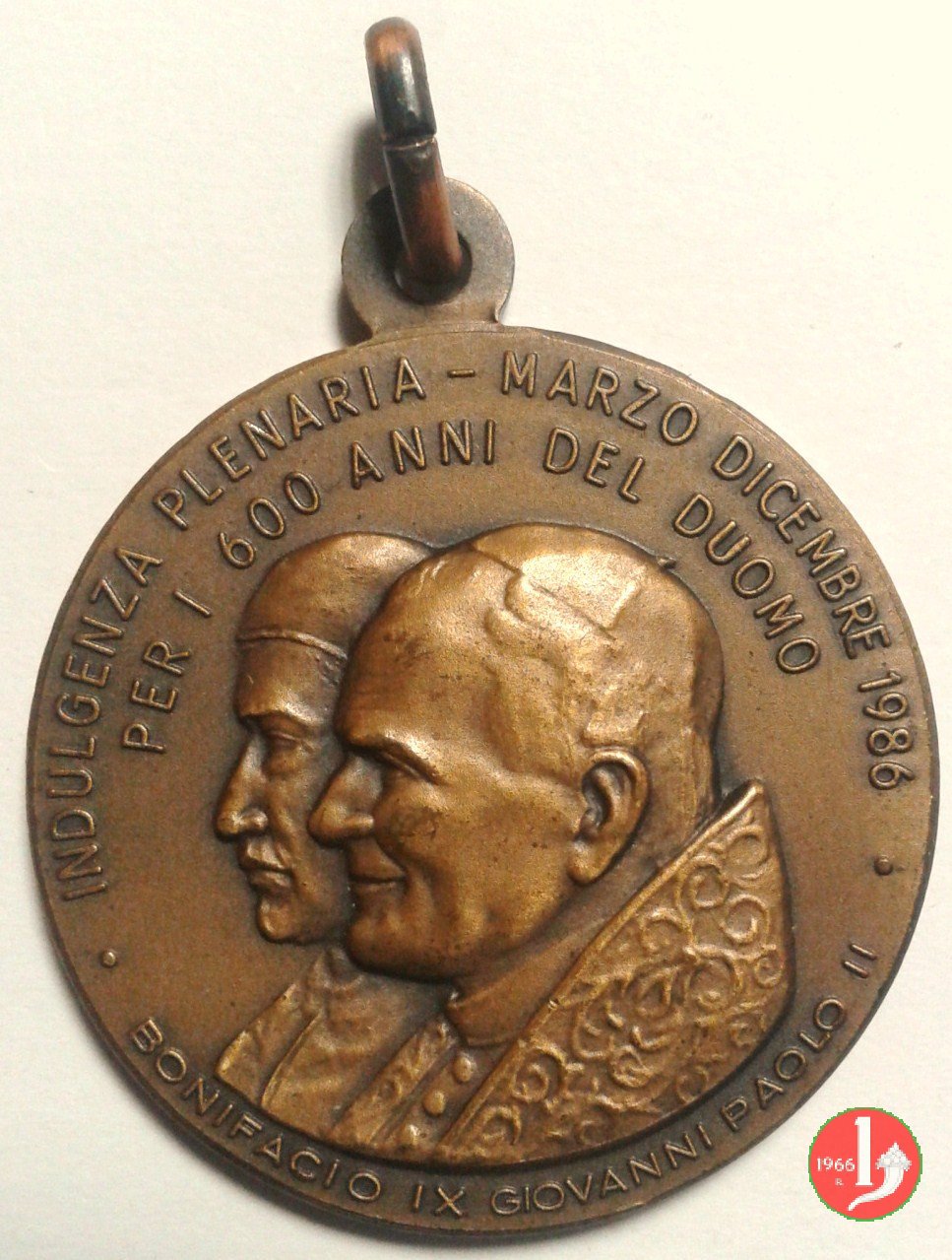 Bonifacio IX - 600° Duomo di Milano Dritto: INDULGENZA PLENARIA MARZO - DICEMBRE 1986 = PER I 600 ANNI DEL DUOMO busti accollati a sx di Bonifacio IX con camauro e mozzetta e di Giovanni Paolo II con berretto, mozzetta e stola sotto, circolarmente: • BONIFACIO IX GIOVANNI PAOLO II • | |