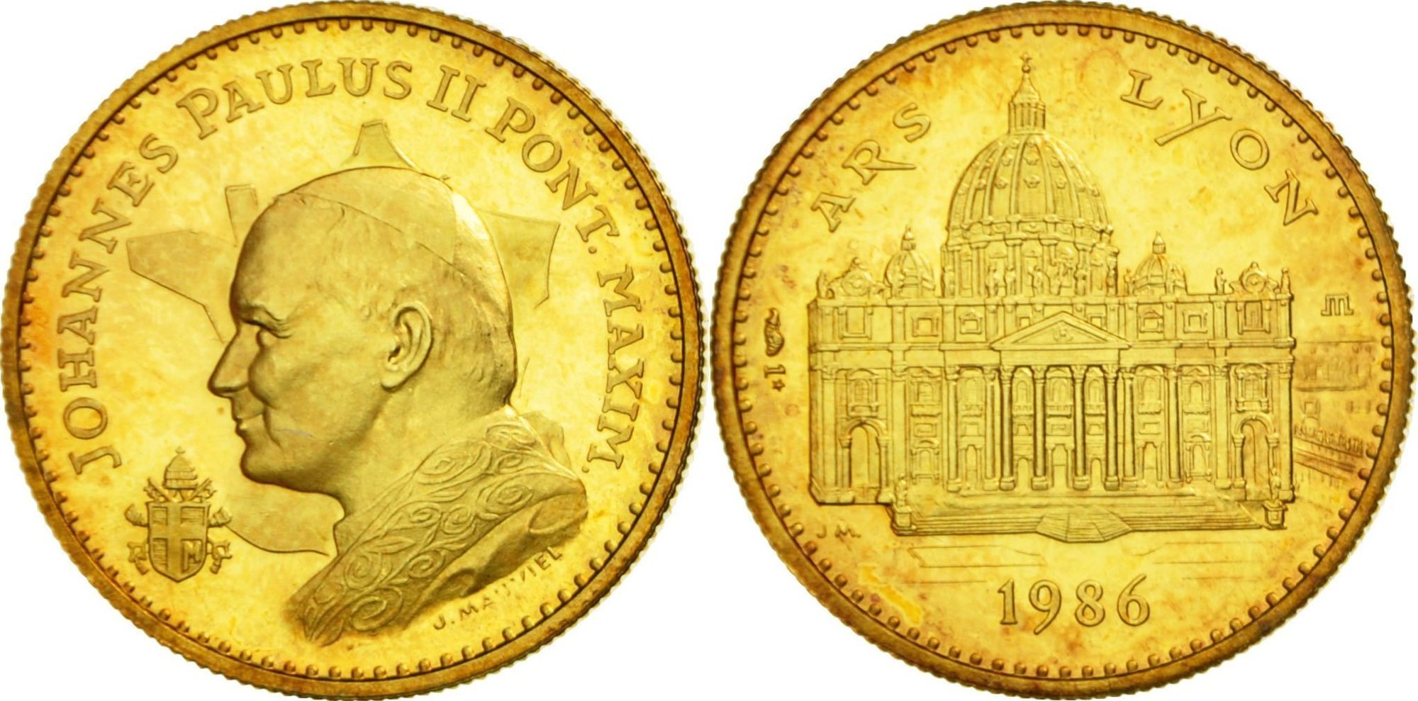 Visita a Lione-Ars a Lyon 07-10-1986 Dritto: JOHANNES PAULUS II PONT. MAXIM. busto a sx con berretto, mozzetta e stola sulla sagoma della Francia in basso a sx: Stemma Papale sotto: N. MANUHEL Prospetto anteriore della Basilica di San Pietro in Roma in esergo: 1986 | |