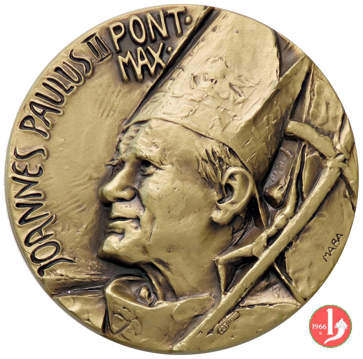 Vita di G.P. II - 1980 I° Viaggio in Germania Dritto: VITA DI GIOVANNI PAOLO II = KAROL JOSEF WOJTYLA * 1920 ✠ 2005 Stemma Papale su chiavi decussate coronato da triregno, tra PX e l'agnello di Dio, entro medaglie Il Papa in piedi di 3/4 a dx con cappotto parla alla folla a dx, entro medaglia: Stemma Papale su chiavi decussate coronato da triregno | |