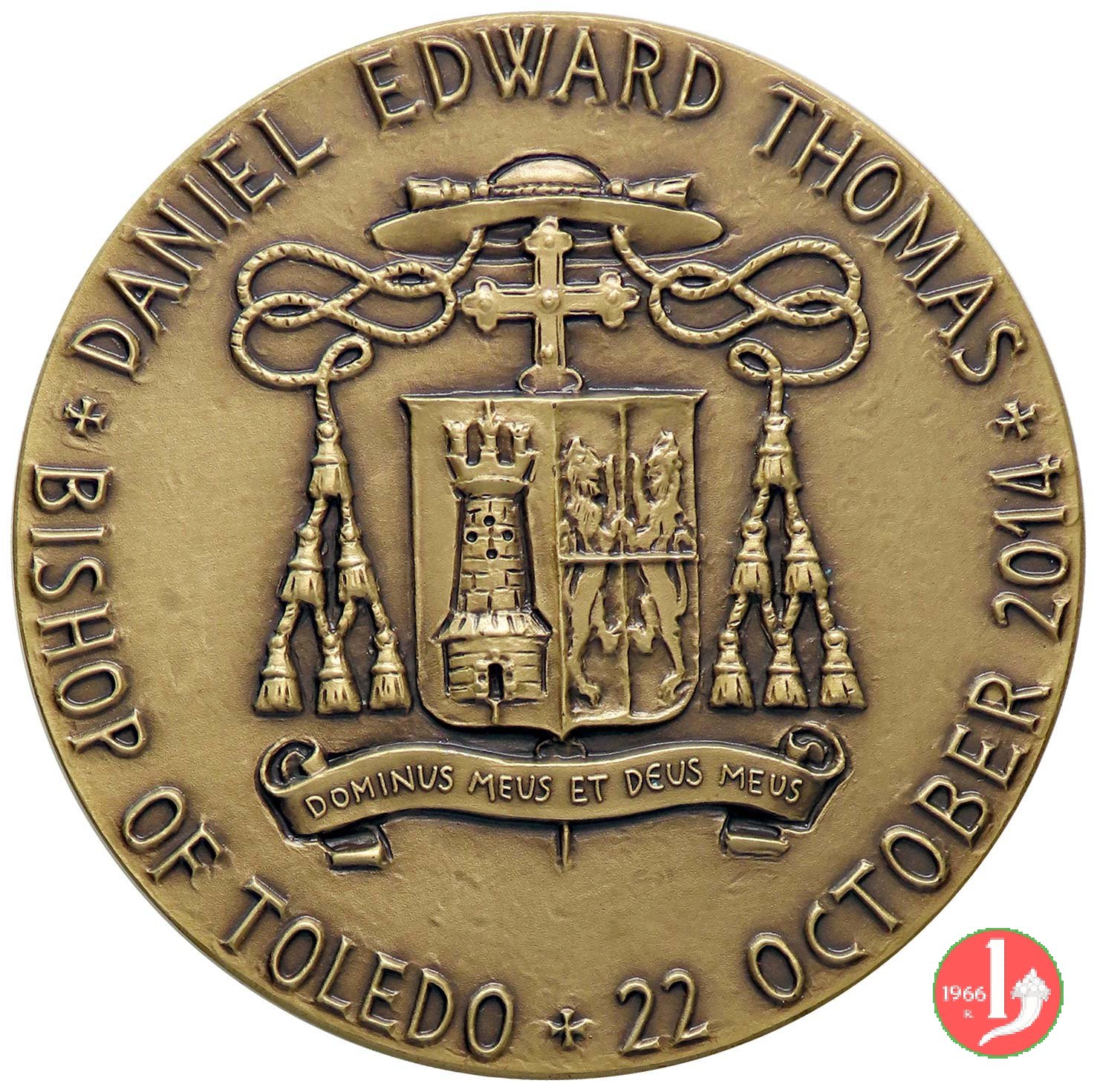Daniel Edward Thomas - Vescovo di Toledo 22-10-2014 Dritto: JOANNES PAULUS II PONT • = MAX • busto a sx con mitra, pallio e pastorale in basso a dx: CDF ITALY _ MA BA Stemma Vescovile sormontato da Croce e da galero a sei nodi (o nappe) su motto in nastro DOMINUS MEUS ET DEUS MEUS | |