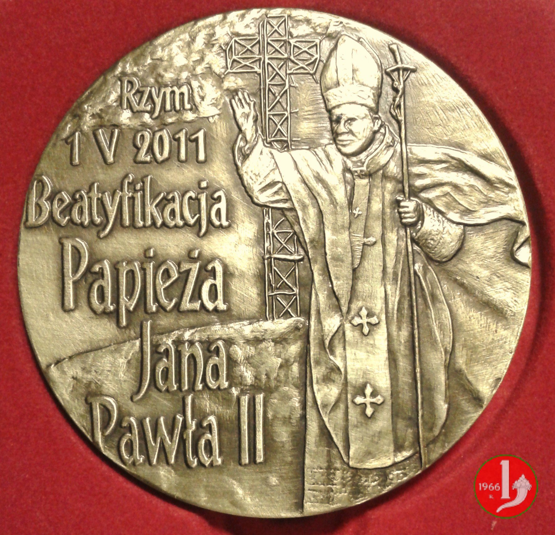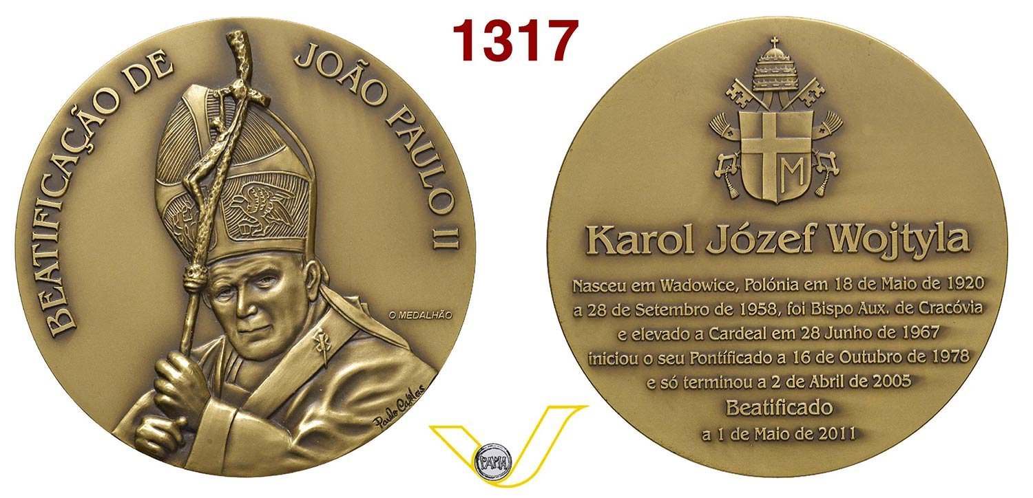 Beatificazione Giovanni Paolo II P 01-05-2011 Dritto: BEATIFICACAO DE _ JOAO PAULO II busto di 3/4 a sx con mitra, pastorale, pianeta e pallio nel campo, a dx: O MEDALHAO sulla spalla, corsivo: PAULO CADELAS nel campo: KAROL JOZEF WOJTHYLA = NASCEUM EM WODOWICE, POLONIA EM 18 DE MAIO DE 1920 = A 28 DE SETEMBRO DE 1958, FOI BISPO AUX. DE CRACOVIA = E ELEVADO A CARDENAL EM 28 JUNHO DE 1967 = INICIOU O SEU PONTIFICADO A 16 DE OUTUBRO DE 1978 = E SO TERMINOU A 2 DE ABRIL DE 2005 = BEATIFICADO = A 1 DE MAIO DE 2011 | |
