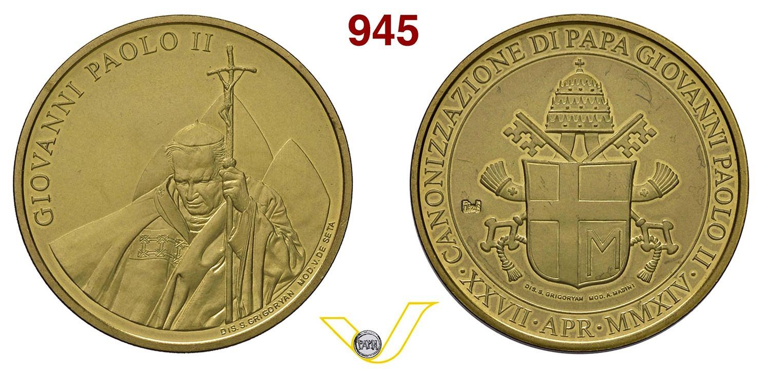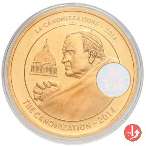 Canonizzazione di Giovanni Paolo II 2014 Dritto: LA CANONIZZAZIONE - 2014 = THE CANONIZATION - 2014 busto orante a sx con berretto e pianeta, nel campo, a sx la Cupola della Basilica di San Pietro; sul busto, entro medaglia Stemma Papale Stemma Papale su chiavi decussate e coronato da triregno tra medaglie con monogramma di Cristo PX e l'Agnello di Dio | |