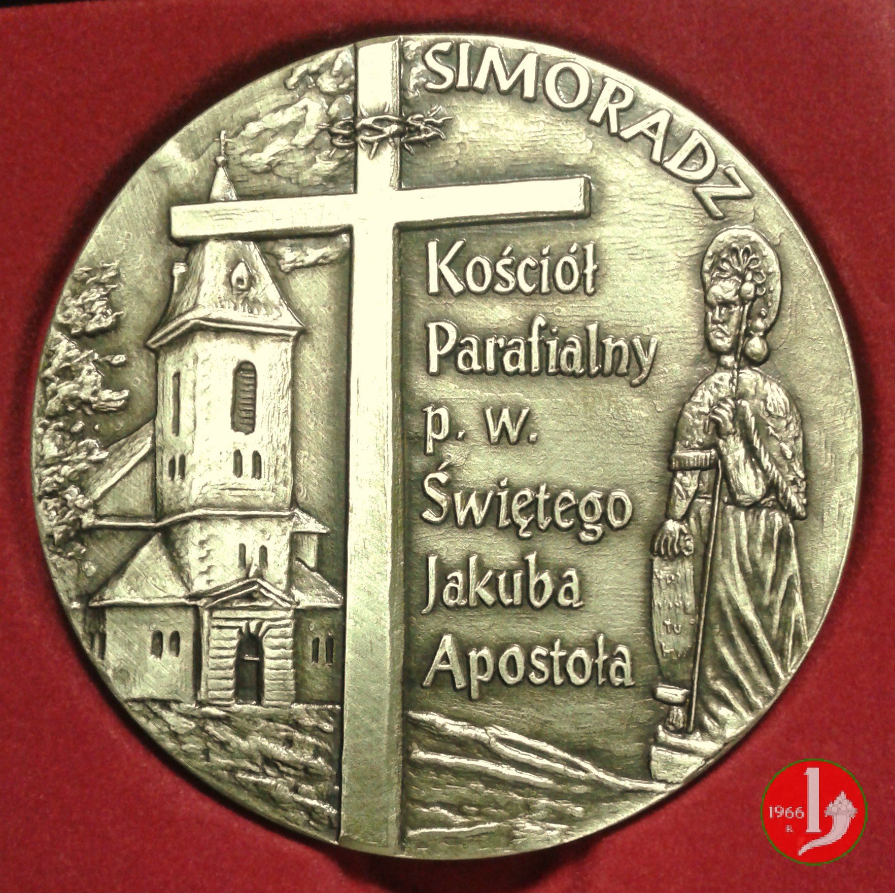 Beatificazione Simoradz 01-05-2011 Dritto: Giovanni Paolo II in piedi, benedicente a sx con mitra, pianeta, pastorale e pallio sullo sfondo: Croce a traliccio nel campo, a sx: RZYM = 2 V 2011 = BEATYFICACJA = PAPIEZA = JANA = PAWLA Grande Croce coronata da spine tra la Chiesa di San Giacomo a Simoradz e San Giacomo nimbato che regge bastone del pellegrino e cartiglio nel campo, a dx: KOSCIOL = PARAFIALNY = P.W. = SWIETEGO = JAKUBA = APOSTOLA | |