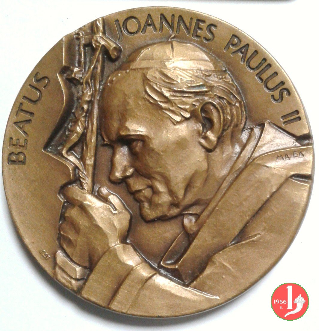 Beatificazione - Stemma Dritto: BEATUS _ JOANNES PAULUS II buso a sx con berretto, pianeta, pallio e pastorale sul pallio, a dx: MABA in basso, a sx: CDF | |