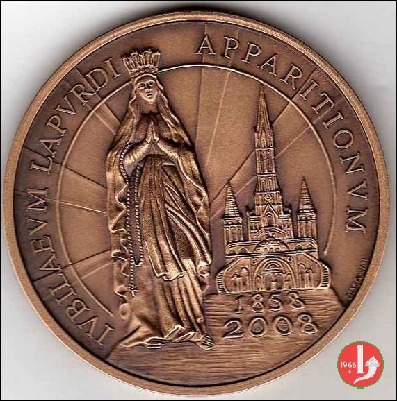 a sx L'immagine della B.V. di Lourdes raggiante di fronte, a dx la Basilica di Lourdes e sotto: 1858 = 2008
