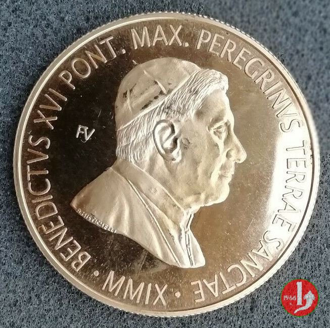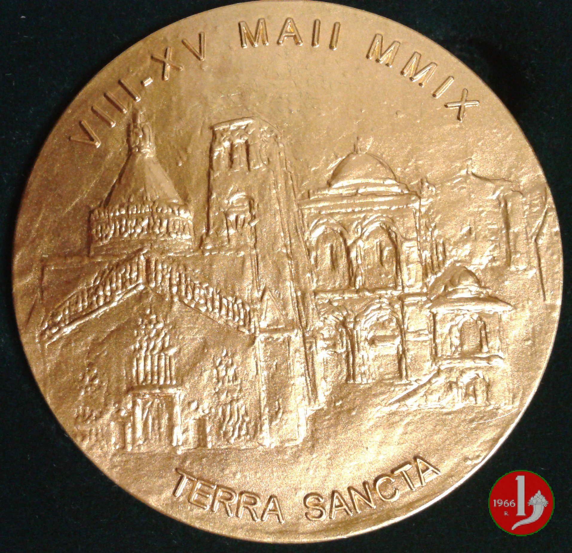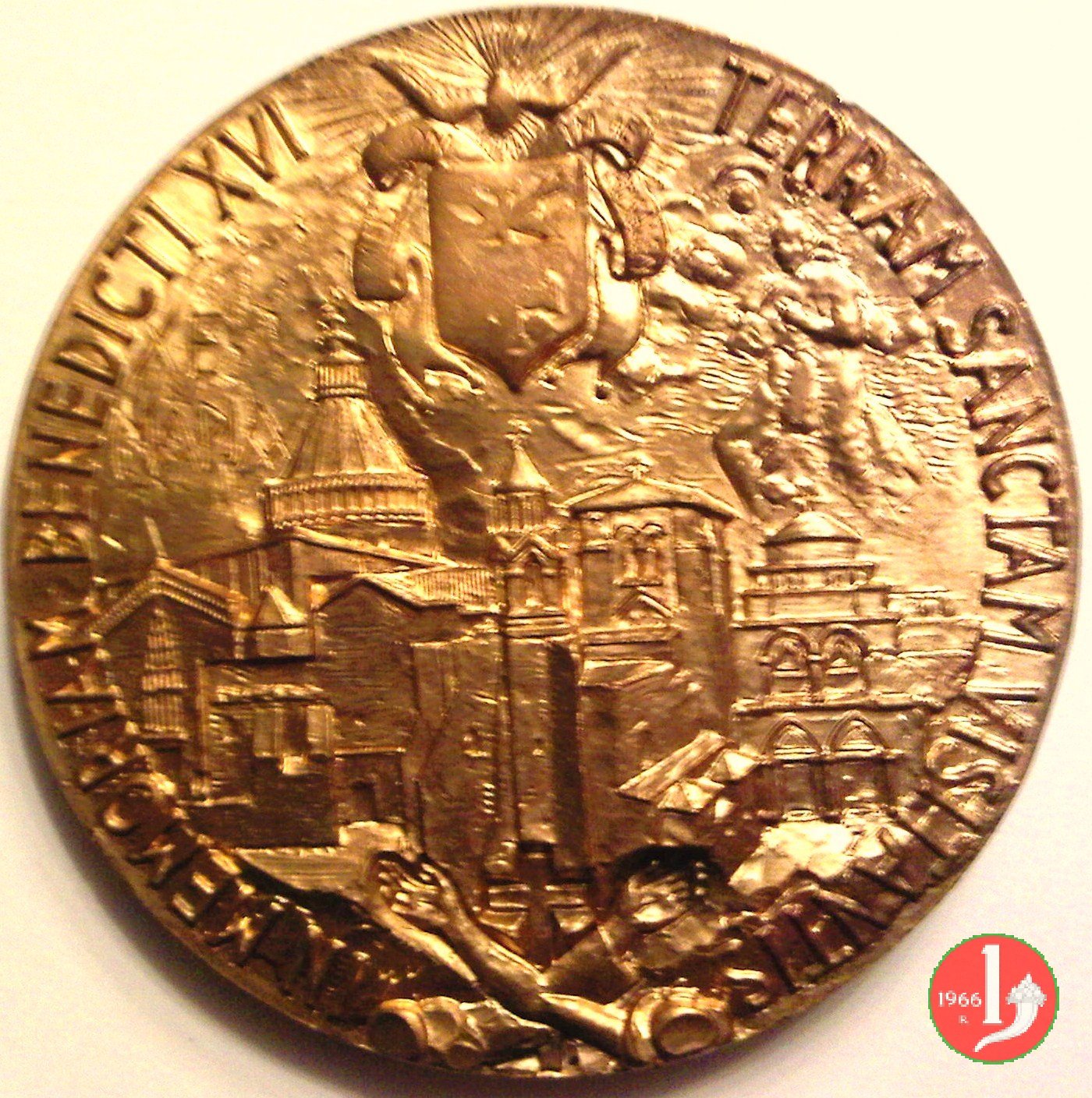 Visita in Terra Santa 08-05-2009 Dritto: BENEDICTUS XVI. _ PONT. MAX. busto di 3/4 a sx con mitra e pastorale sopra alla spalla dx, corsivo: A. MISTICHELLI composizione di prospetti delle Basiliche di Terra Santa sotto circolamente: TERRA SANCTA | |