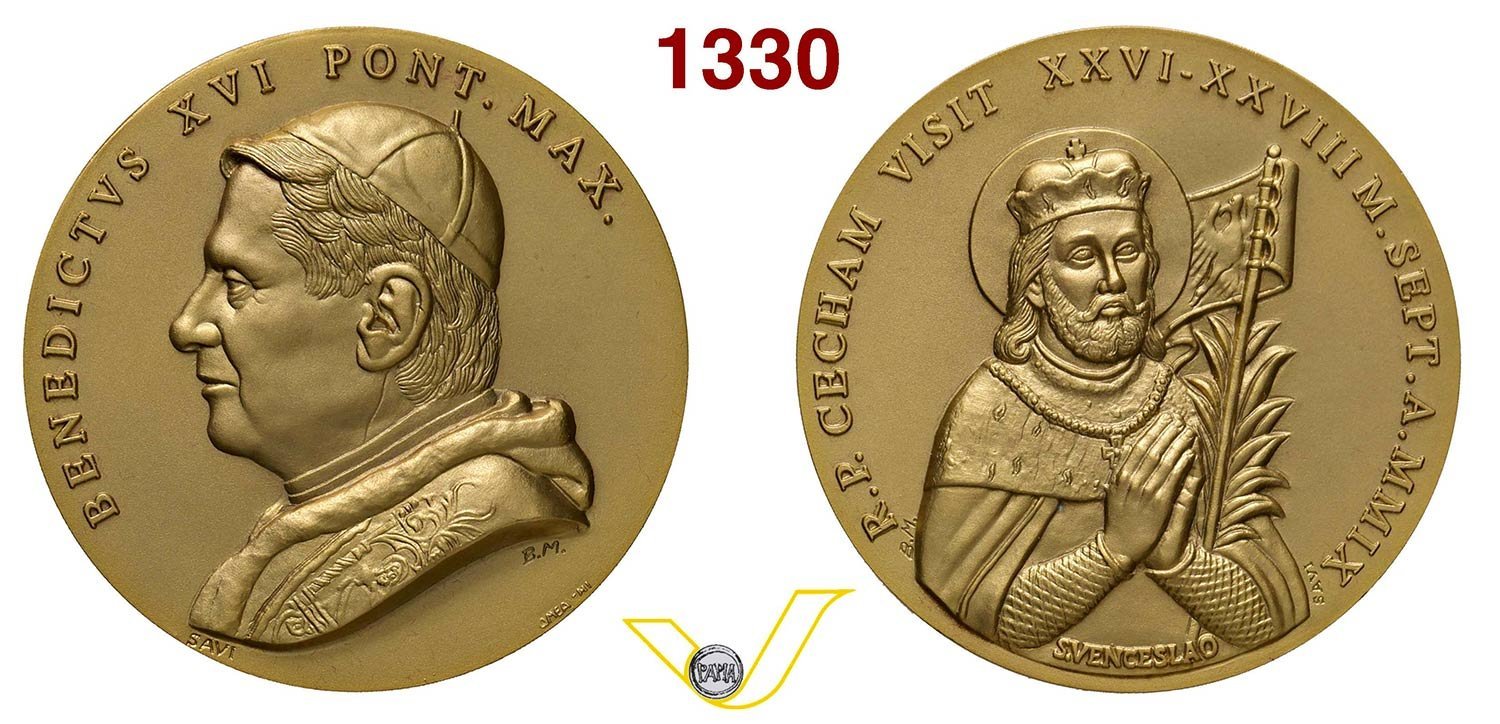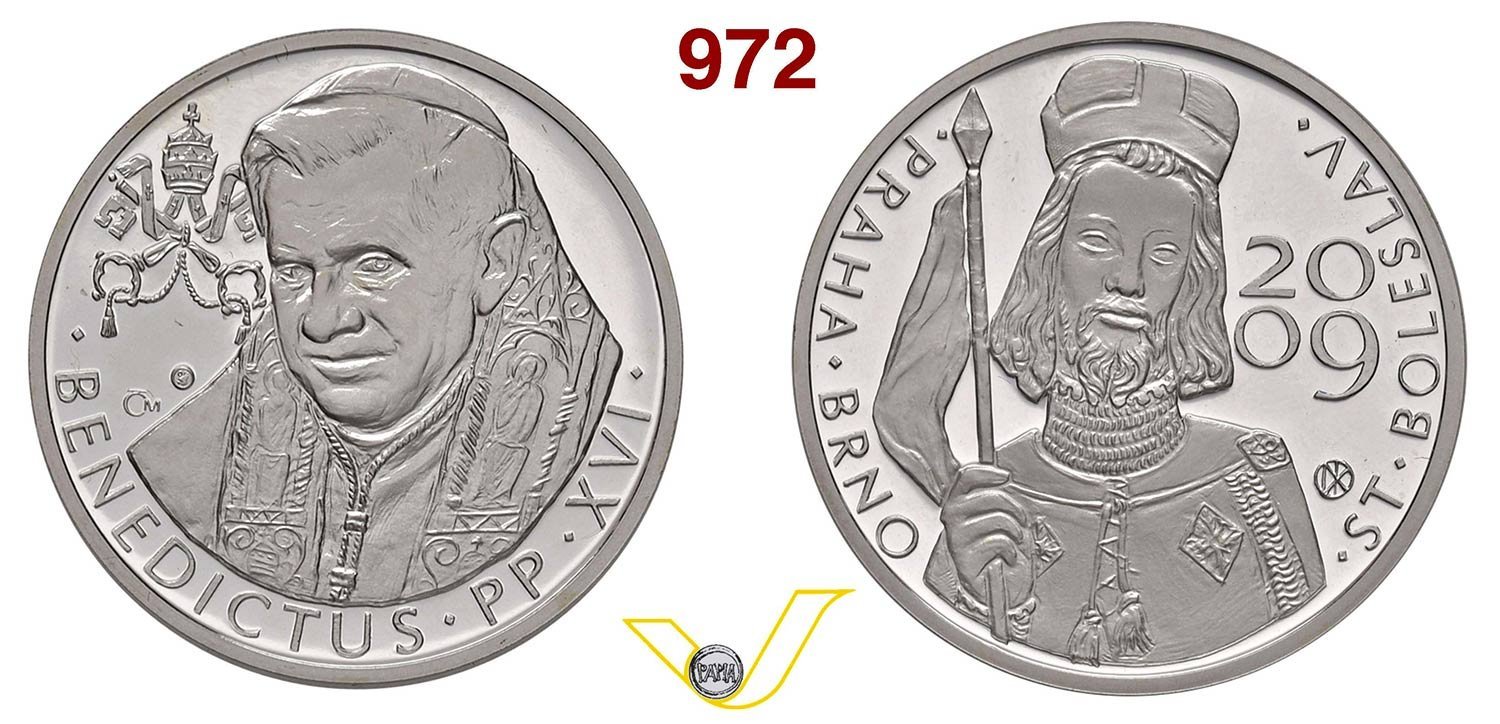 Visita nella Repubblica Ceca 26-09-2009 Dritto: BENEDICTVS XVI _ PONT. MAX. busto a sx con berretto, mozzetta d'ermellino e stola sotto: SAVI _ B.M. in basso: OMEA - MI busto orante nimbato e coronato di fronte di San Venceslao, regge ramo di palma e stendardo sotto: S. VENCESLAO in basso a dx: SAVI | |