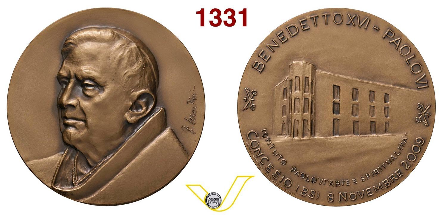 Visita a Concesio 08-11-2009 Dritto: Busti affrontati di Benedetto XVI e di Paolo VI si stringono le mani in basso: RUBEGNI Stemma coronato e tra rami d'alloro della città di Concesio tra 4 campanili delle chiese della città in basso: 8 NOVEMBRE 2009 in basso a dx presso il bordo: OMEA-MI | |