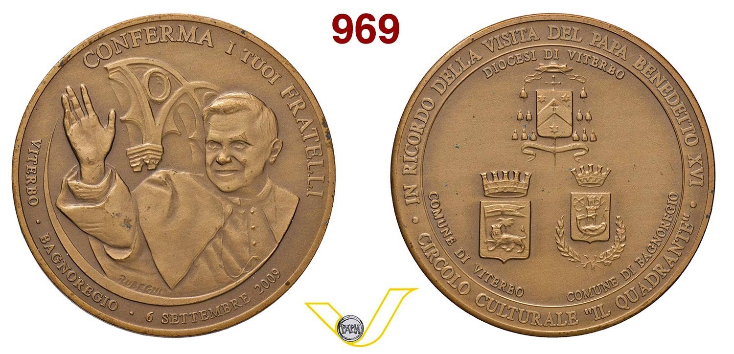 Visita a Viterbo e Bagnoregio 06-09-2009 Dritto: CONFERMA I TUOI FRATELLI busto benedicente di 3/4 a sx con zucchetto, abito talare e Croce pettorale e sullo sfondo trifora gotica sotto: RUBEGNI in basso circolarmente: VITERBO • BAGNOREGIO • 6 SETTEMBRE 2009 entro cornice circolare continua: DIOCESI DI VITERBO = COMUNE DI VITERBO COMUNE DI BAGNOREGIO Stemma vescovile sormontato da Croce e da galero a sei nodi o nappe in basso: Stemmi affiancati e coronati di Viterno e Bagnoregio | |
