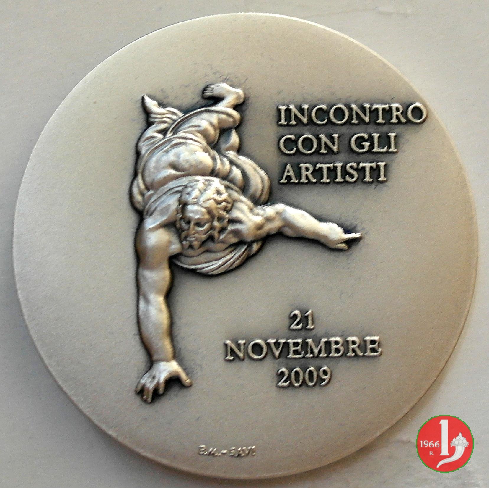 Incontro con gli Artisti 21-11-2009 Dritto: BENEDICTVS XVI PONT. MAX. busto a sx con berretto, mozzetta e stola sotto, a dx: B.M. in basso a sx: SAVI in basso, a dx: OMEA-MI nel campo, a dx: INCONTRO = CON GLI = ARTISTI in basso, a dx: 21 = NOVEMBRE = 2009 sotto: B.M. - SAVI | |