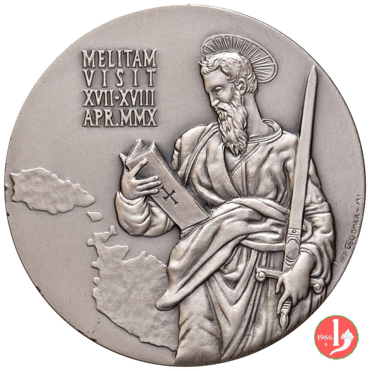 Viaggio a Malta 17-04-2010 Dritto: BENEDICTVS XVI PONT MAX busto di 3/4 a sx con berretto, pianeta e pallio, regge pastorale in basso,a sx: A. VECCHIO sullo sfondo: planimetria dell'Isola di Malta nel campo, in alto, a sx: MELITAM = VISIT = XVII-XVIII = APR. MMX a dx presso il bordo: OMEA - MI | |