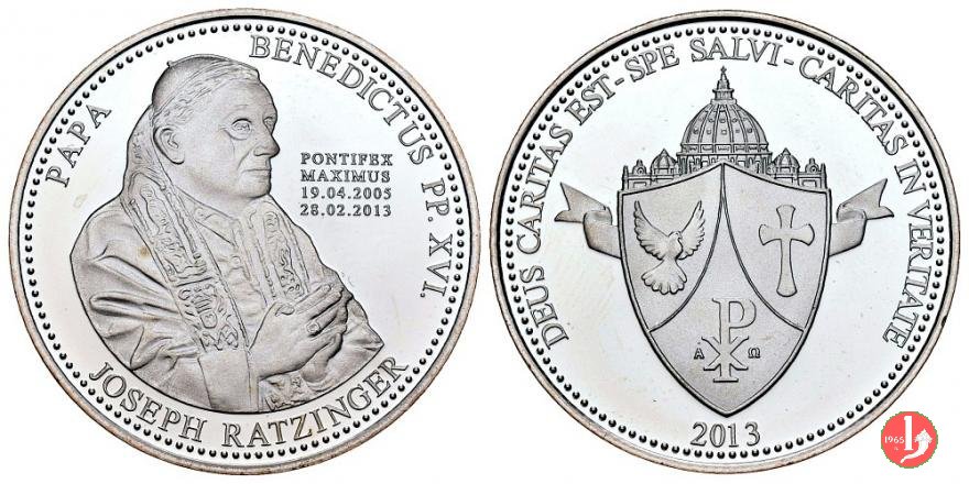 Encicliche 2013 Dritto: PAPA _ BENEDICTUS PP. XVI. = JOSEPH RATZINGER busto di 3/4 a dx orante con zucchetto, mozzetta e stola nel campo a dx: PONTIFEX = MAXIMUS = 19.04.2005 = 28.02.2013 Stemma a scudetto tripartito con colomba, Croce e Monogramma di Cristo PX, sovrapposto al prospetto anteriore della Basilica di San Pietro sotto: 2013 | |