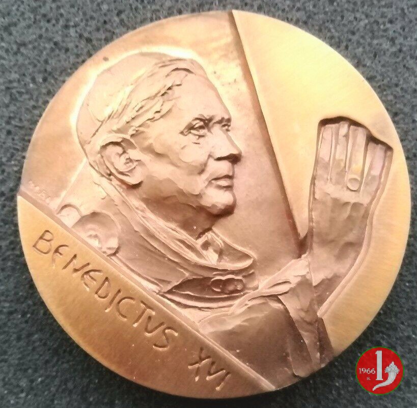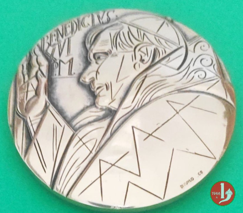 Stemma Papale 119mm Dritto: BENEDETTO XVI PONT. MAX - JOSEF RATZINGER PX entro cornice bilobata: busto di 3/4 a sx con zucchetto e abito talare entro cornice irregolare a sx entro il bordo interno: C. ALIDORI entro cornice bilobata: Stemma tripartito su chiavi decussate e sormontato da mitra tripartita e adornato da pallio | |