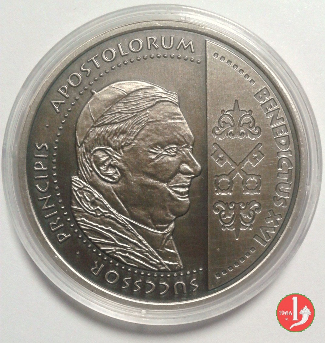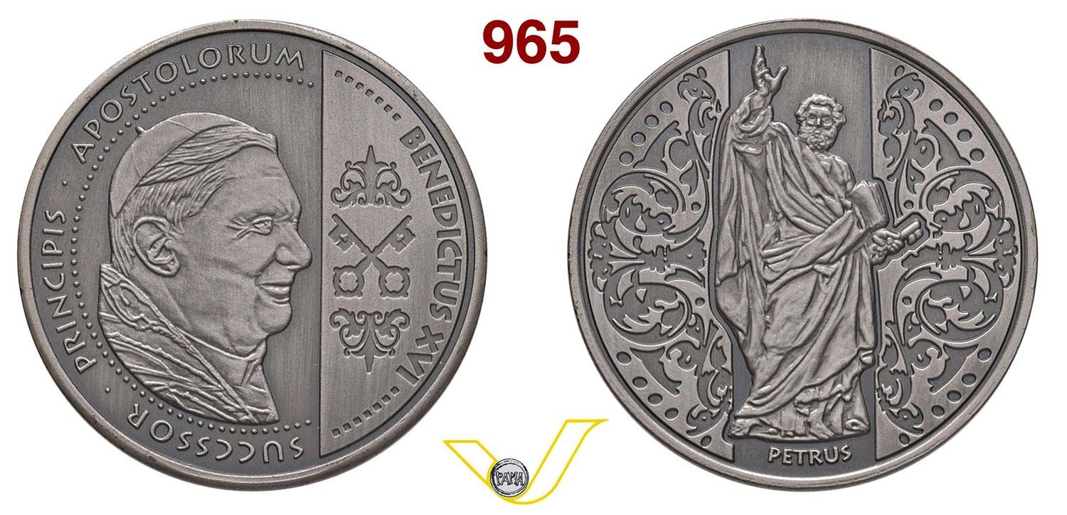 San Pietro 40mm Dritto: SUCCESSOR • PRINCIPIS • APOSTOLORUM _ BENEDICTUS XVI busto sorridente a dx con berretto, mozzetta e stola nel campo, a dx: chiavi decussate tra due fregi sotto: PETRUS | |