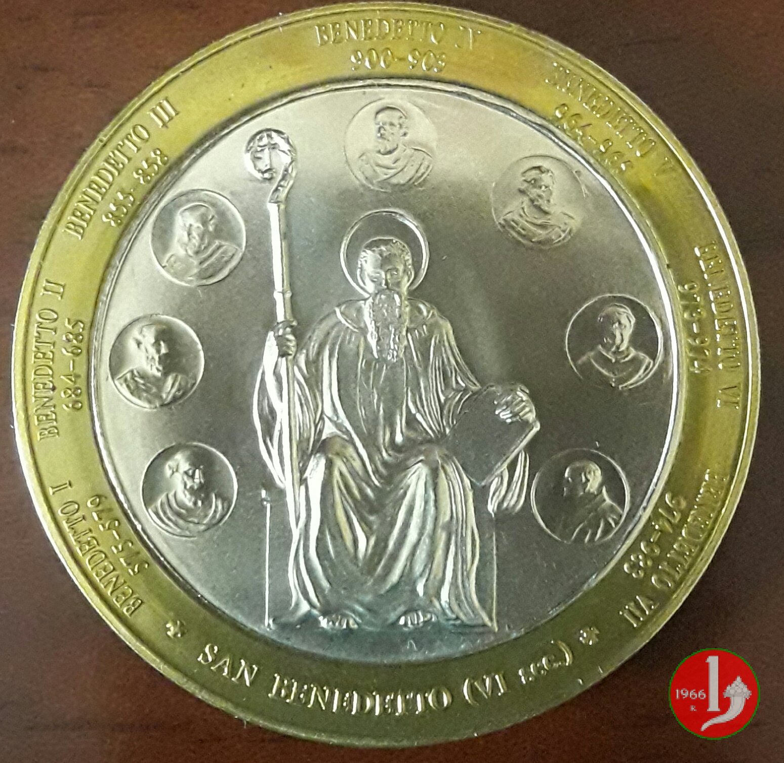 San Benedetto e Papi Benedetto Dritto: in basso: ✠ BENEDETTO XVI PONT. MASSIMO ✠ busto a sx con mitra, attorniato da sette medaglie con i busti di sette Papi predecessori e sul bordo in basso: GIANDOMENICO San Benedetto, nimbaro, seduto di fronte con pastorale, attorniato da sette medaglie con i busti di sette Papi predecessori e sul bordo | |