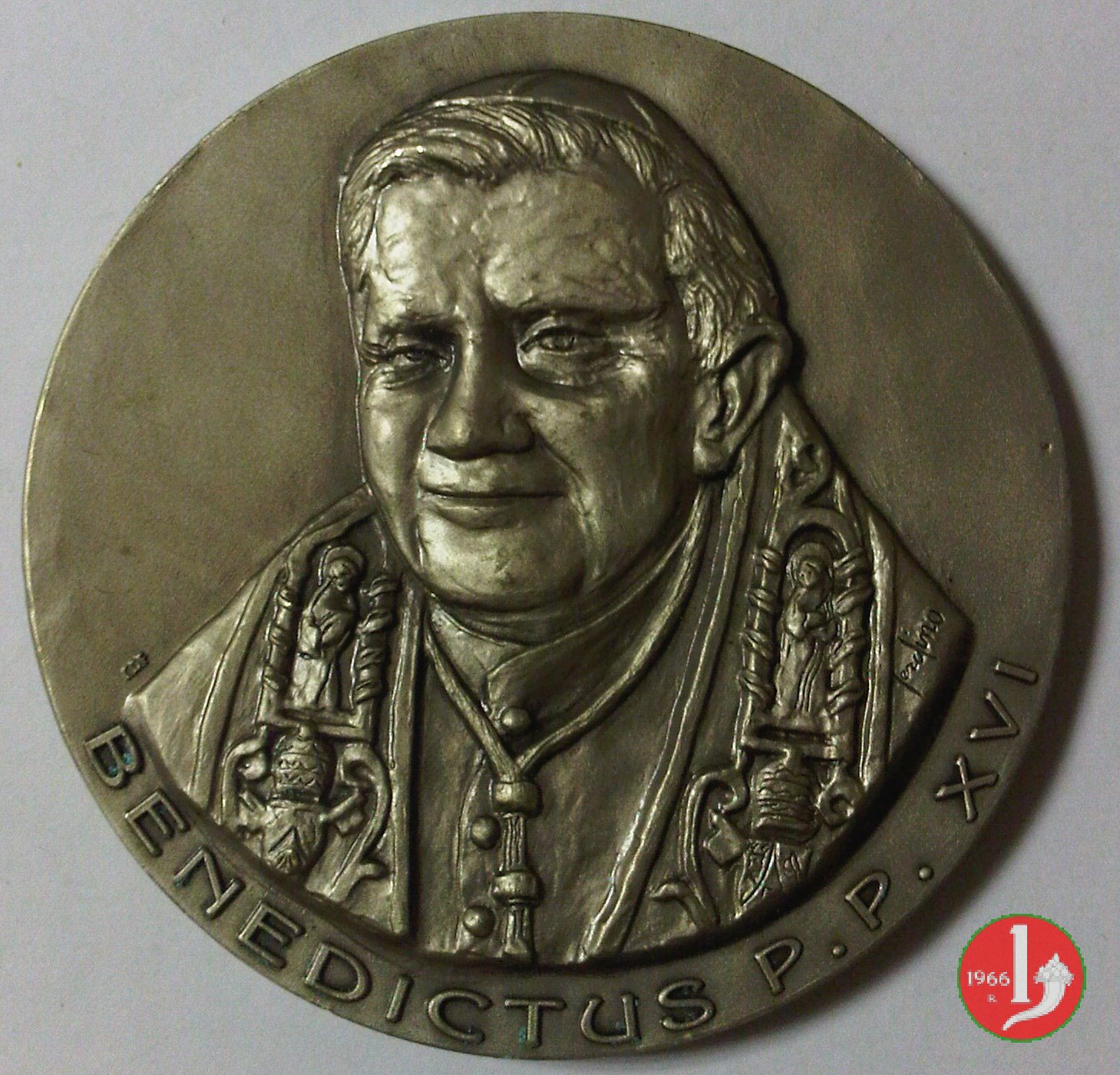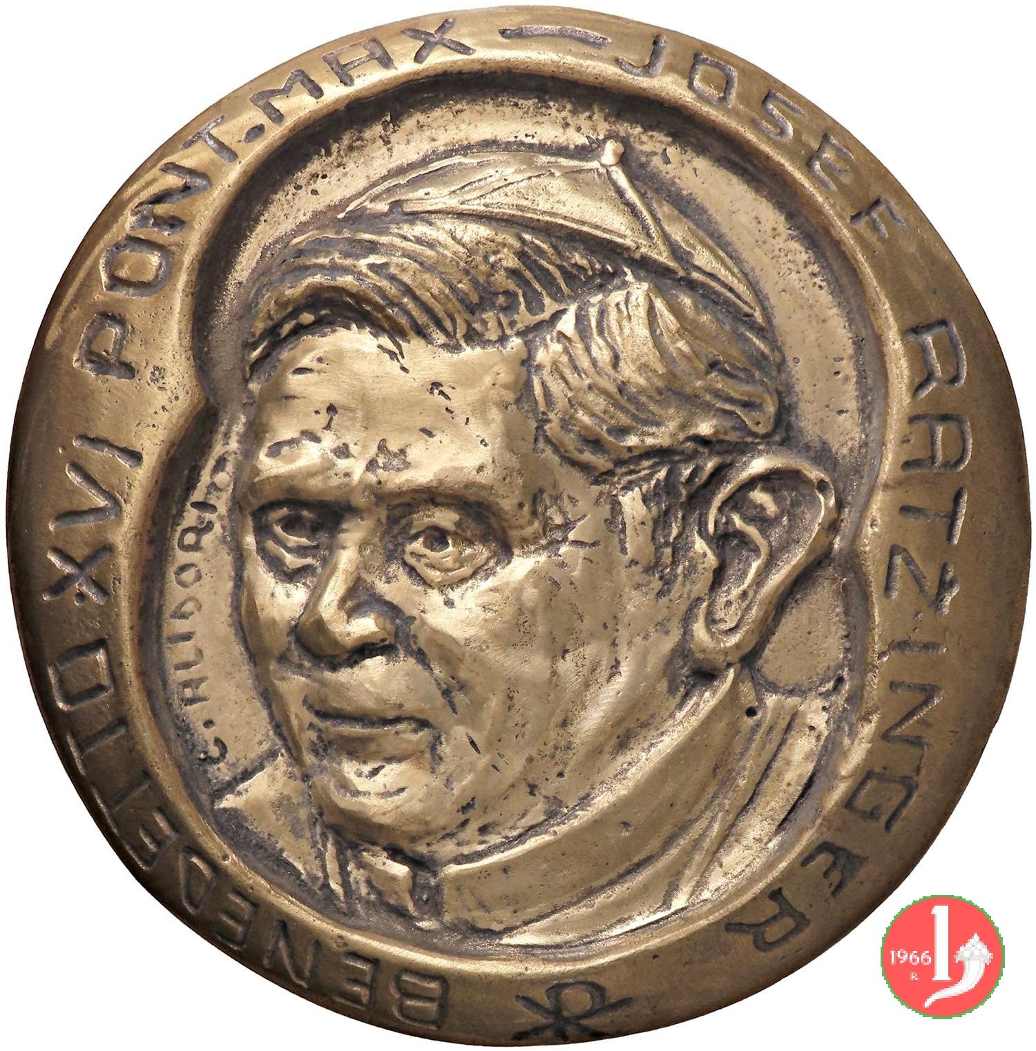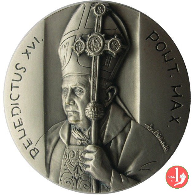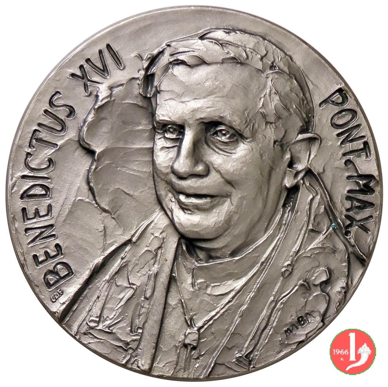 Consegna delle Chiavi Dritto: BENEDICTVS XVI. _ PONT. MAX. Busto di 3/4 a sx con mitra e pianeta, regge pastorale sopra la spalla sx: A. Mistichelli | |