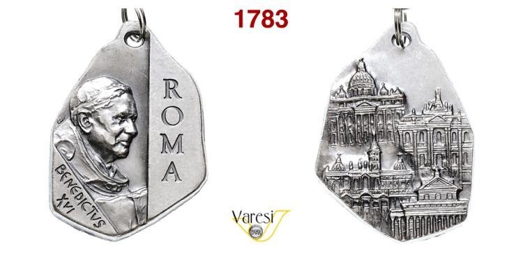 Stemma Papale 50mm Dritto: busto benedicente a dx con zucchetto e pallio in basso a sx, entro nastro diagonale: BENEDICTVS XVI a sx del busto: MABA in basso, ai lati del pallio: CDF _ ITALY sotto: MA _ BA | |
