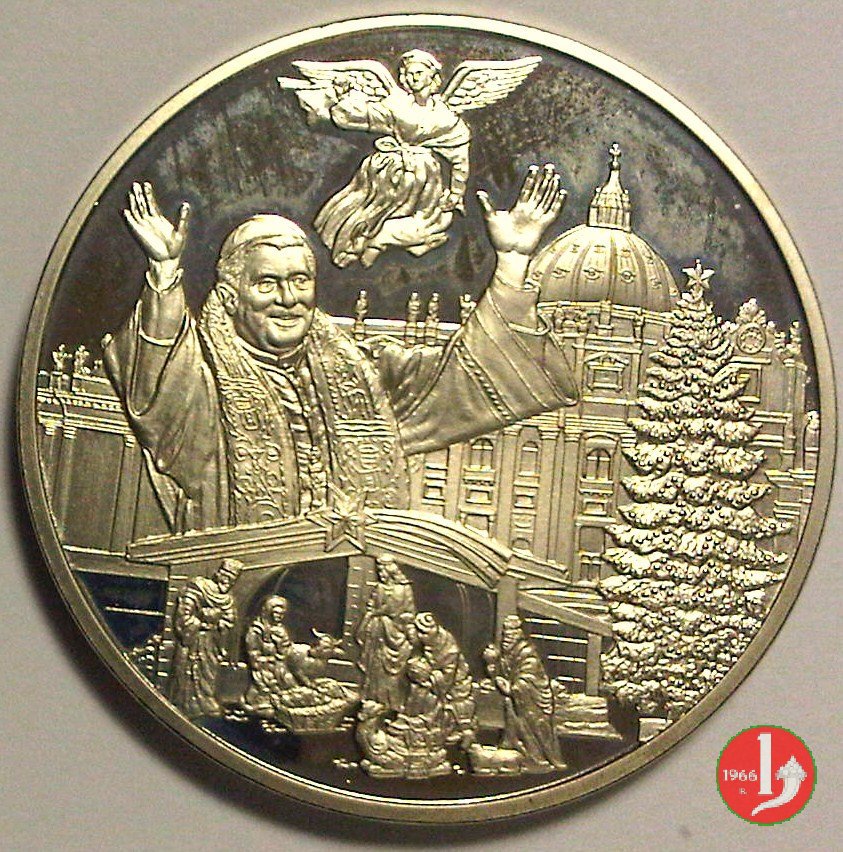 Buon Natale Dritto: entro cerchio di dodici stelle: JOANNES PAULUS II P.M. - BENEDICTUS XVI P.M. = VOBIS MANDAVI ECCLESIAM MEAM busti affrontati di Giovanni Paolo II e Benedetto XVI con zucchetti Croci pettorali ed abiti talari sotto al Busto di Giovanni Paolo II: GIANDOMENICO Piazza San Pietro raggiante con Presepe al centro | |