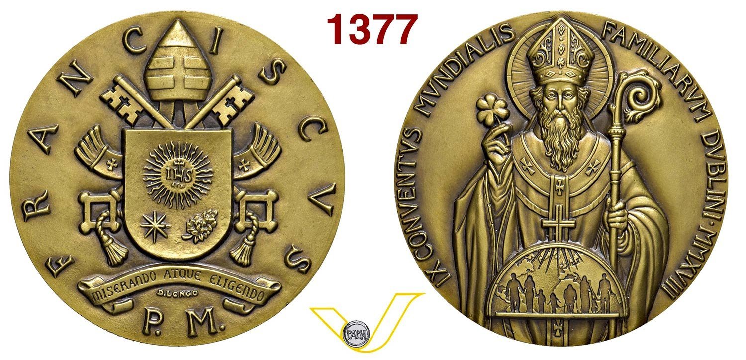 Viaggio in Irlanda 25-08-2018 Dritto: FRANC _ ISCVS Stemma Papale sormontato da mitra tripartita e su chiavi decussate sotto, entro nastro: MISERANTO ATQUE ELIGENDO sotto: D. LONGO in basso: P. M. mezzo busto di fronte di San Patrizio nimbato con mitra, pianeta e pallio, regge trifoglio e pastorale | |