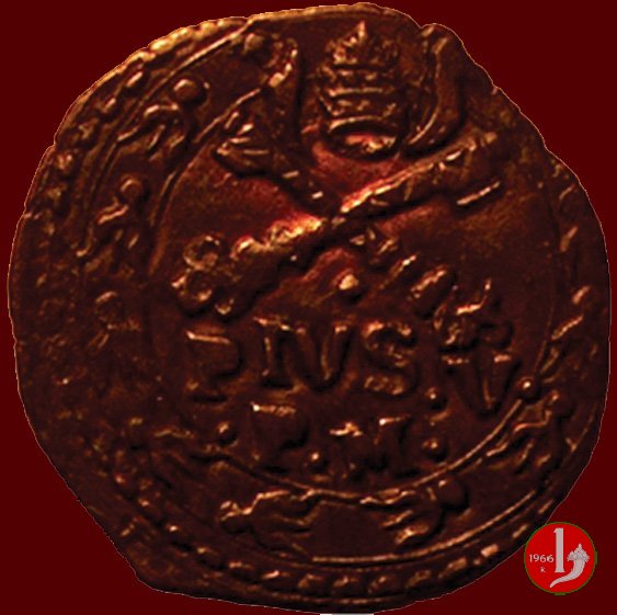 Quattrino (chiavi a tutto campo e legenda nel giro - S.Petrvs con la Città) Obverse: PIVS •V •PP/ Chiavi decussate e tiara; sotto un punto ( •) Reverse: S •PETRVS •CIVITAS •FANI / Figura di S. Pietro seduto con la rappresentazione della città sul ginocchio d. |