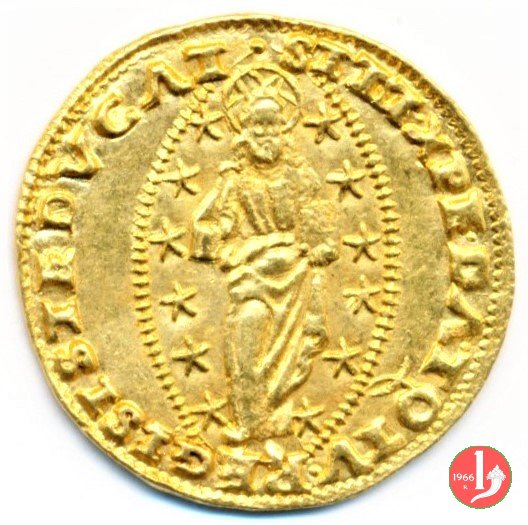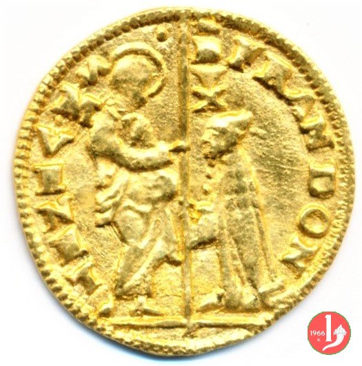 Zecchino Dritto: FRAN DON S (globetto) M (globetto) VENET, S. Marco stante e il doge inginocchiato reggono il vessillo, lungo l'asta DVX Verso: SIT T XPE DAT Q TV REGIS ISTE DVCAT, il Redentore in mandorla stellata | |