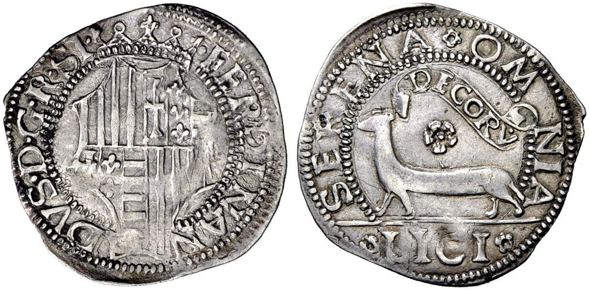 Armellino Dritto: • FERDINANDVS • D • G • R • SI ; Stemma araldico coronato ottagonale. Verso: SERENA ![]() OMNIA ; Armellino a dx sormontato da rosetta e da cartiglio con la scritta DECORV. All'esergo, tra due rosette, LICI. | |