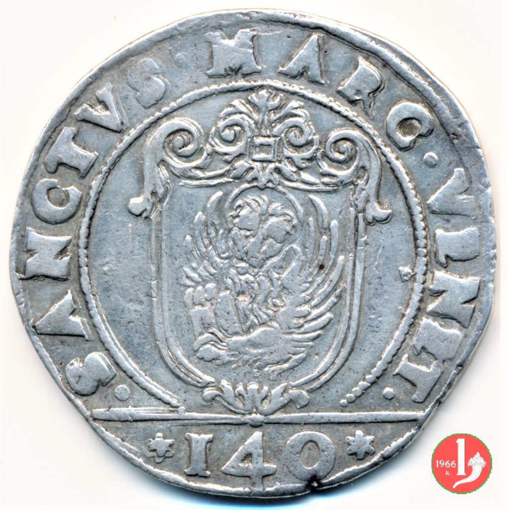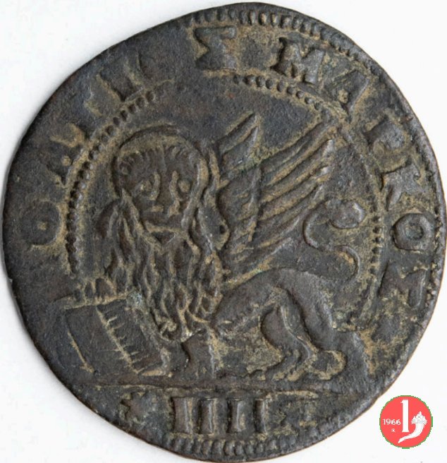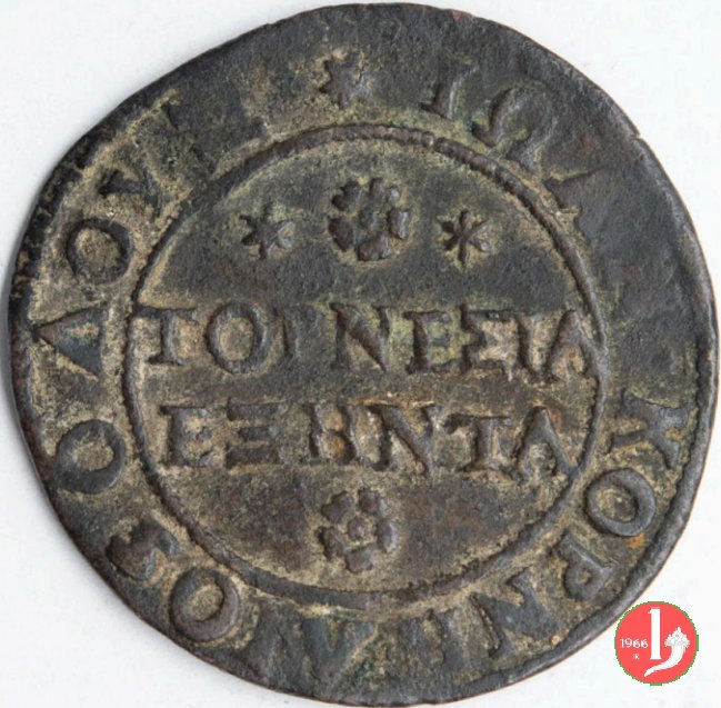 60 tornesi per Candia Dritto: IΩAN KOPNHΛIOΣ Ο ΔOYΞ attorno; TOPNEΣIA EΞHNTA nel campo in due righe, sopra rosetta accompagnata da due stelle, in basso rosetta; tutto in un cerchio. Verso: O AΓIOΣ MAPKOΣ Leone alato andante a sinistra con la testa frontale, la zampa destra anteriore sul libro aperto; il tutto in un cerchio di perline; all’esergo IIII • | |