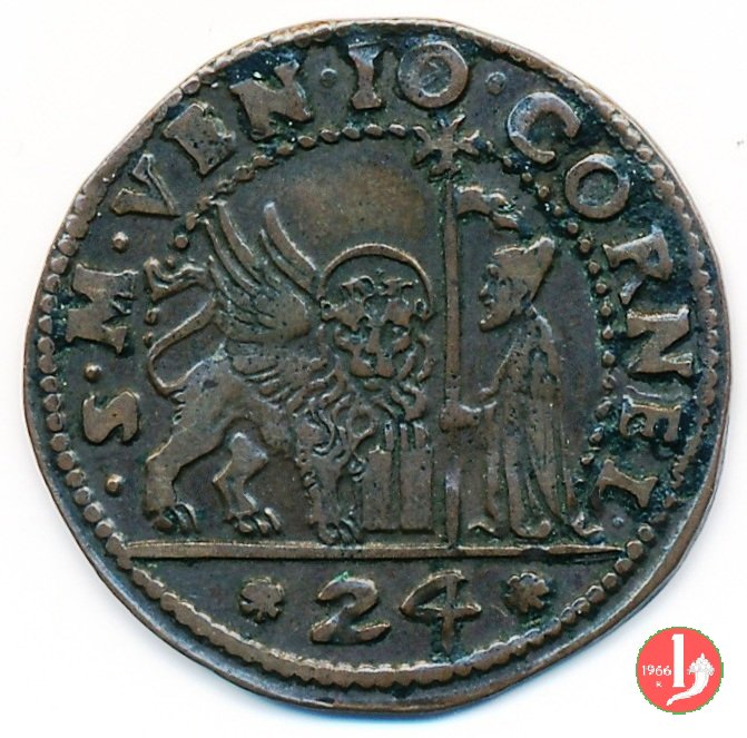 2 soldi o 24 bagattini Dritto: S M VEN IO CORNEL, doge e leone, in es. * 24 * Verso: * DEFENS NOSTER *, il Redentore | |
