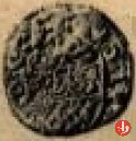 Quattrino o sesino con scritta e libro Dritto: Anepigrafe Nel campo: scritta MIRANDVLA su tre righe. Nel campo: libro chiuso con l'angolo inferiore rialzato, avente le scritte OMNINO su tre righe sulla pagina esterna, e B KA a triangolo nell'angolo inferiore sinistro della pagina interna. Ai lati, C I su due righe a sinistra, e A a destra. Sotto, aquiletta bicipite. | |