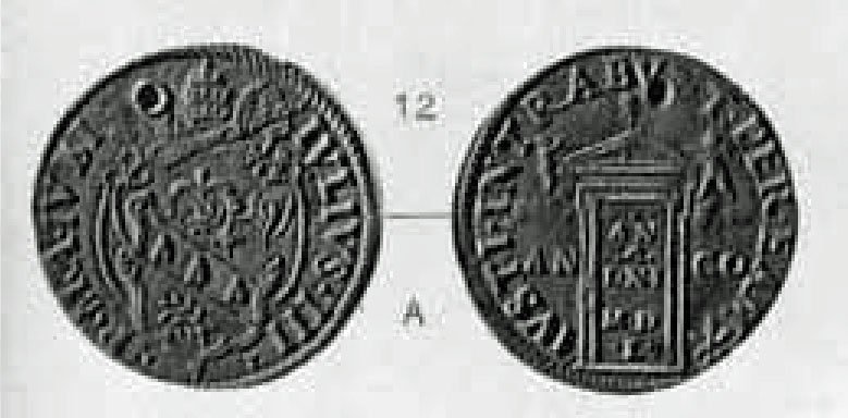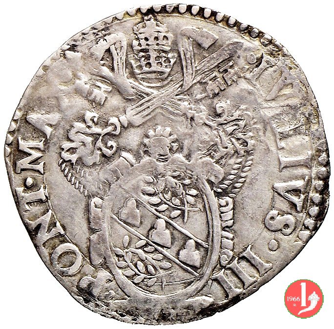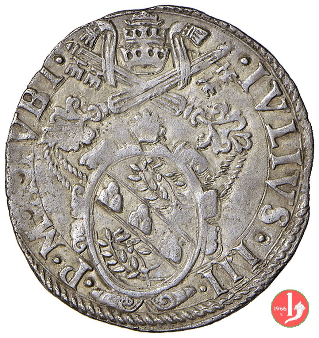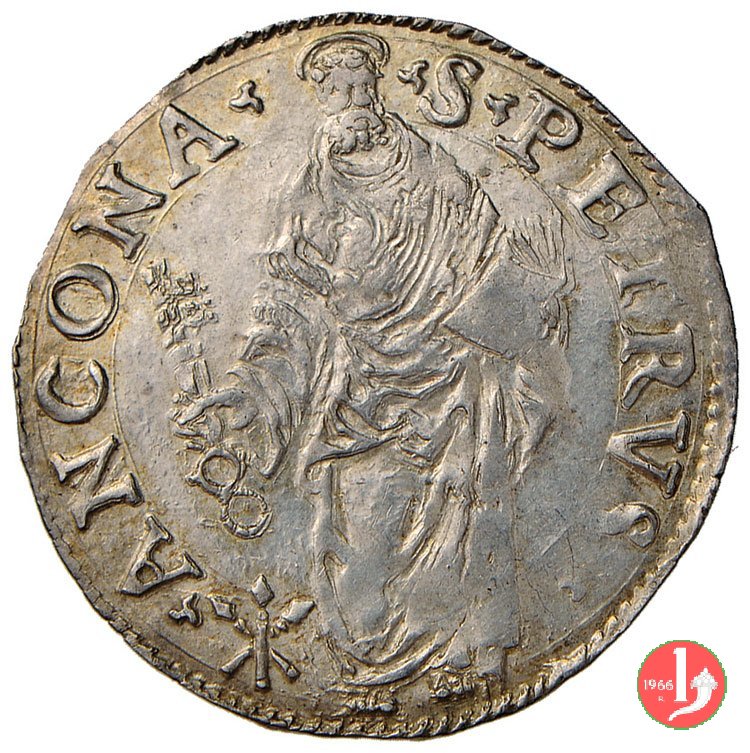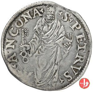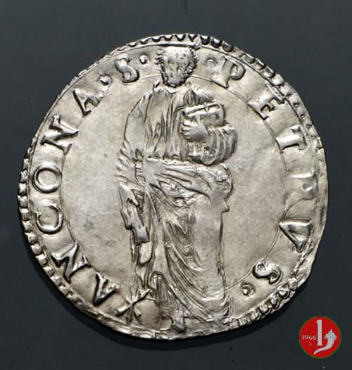 Giulio (S.Pietro) - Stemma a targa Dritto: IVLIVS^III^__^PONT^MAX^ /Stemma a targa con ornati e sopra un fiore a globo, sormontato da chiavi dec. e tiara Verso: •S •PETRVS •__ ![]() ANCONA • / S.Pietro con nimbo circolare in piedi di fronte, chiavi pendenti nella destra e libro nella sinistra stretto contro il petto. | |